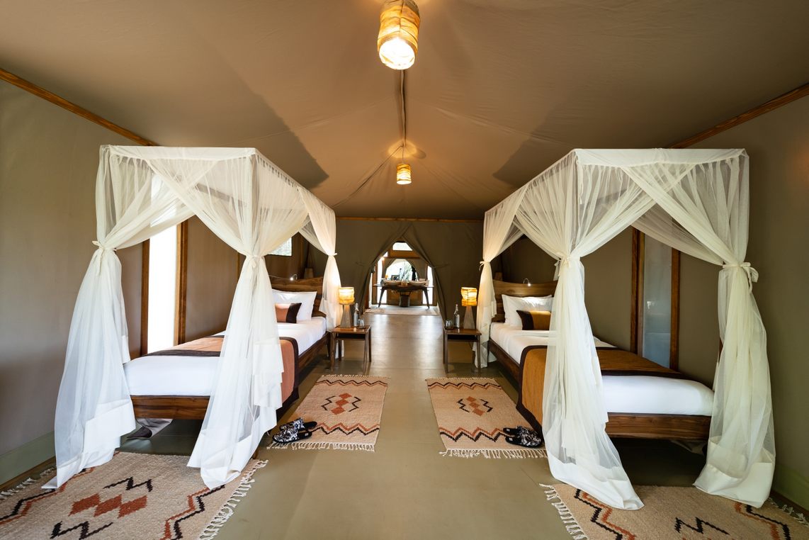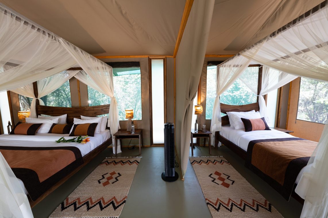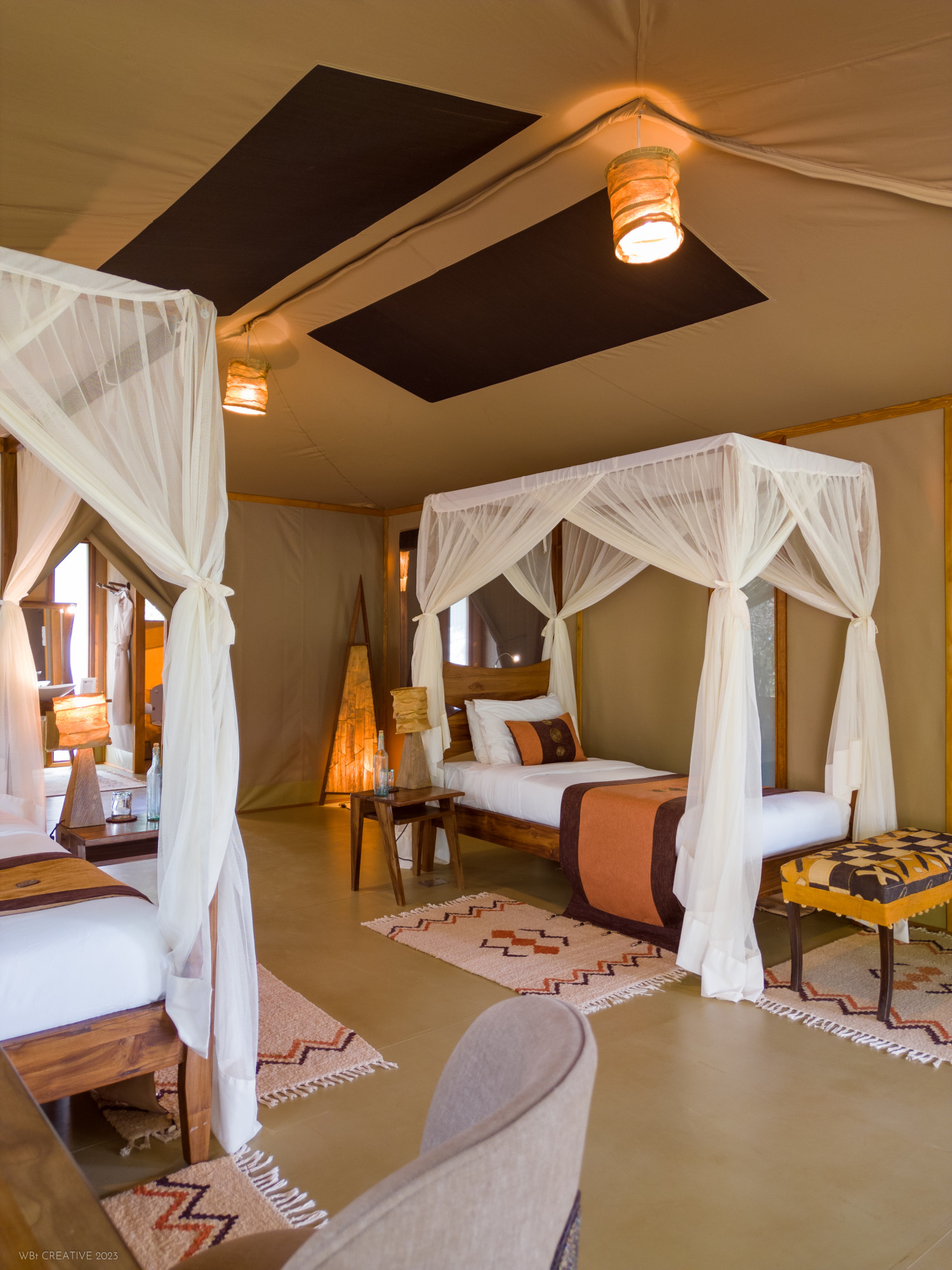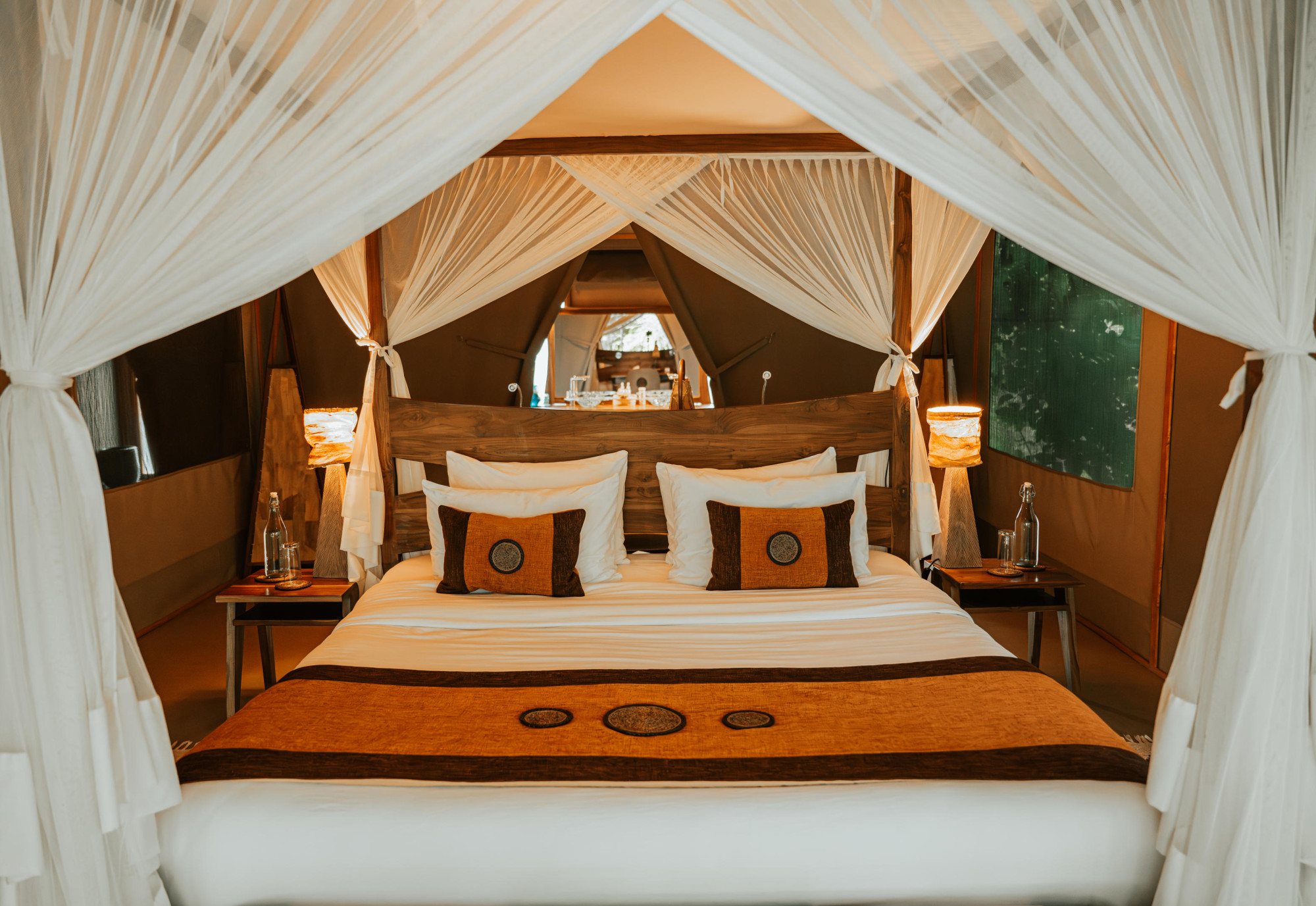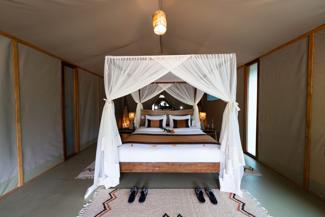 Alle Gästezelte sind mit bequemen Himmelbetten, Moskitonetzen, Badezimmern (WC, Duschen mit Warm- & Kaltwasser), Schreibtisch und privater Veranda ausgestattet und bieten besten Komfort. Das Familien-Zelt besteht aus 2 Zimmern mit eigenem Bad und gemeinsamen Wohnzimmer.