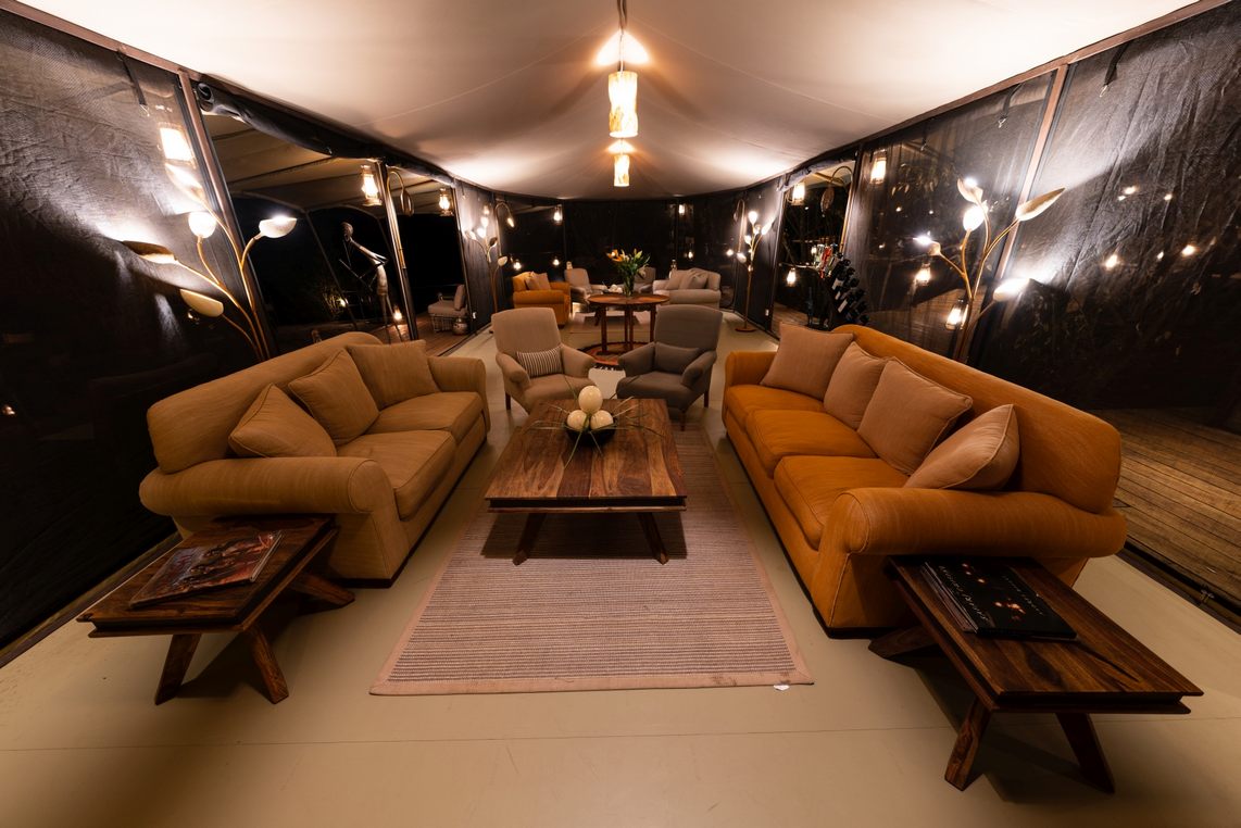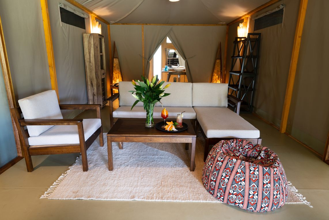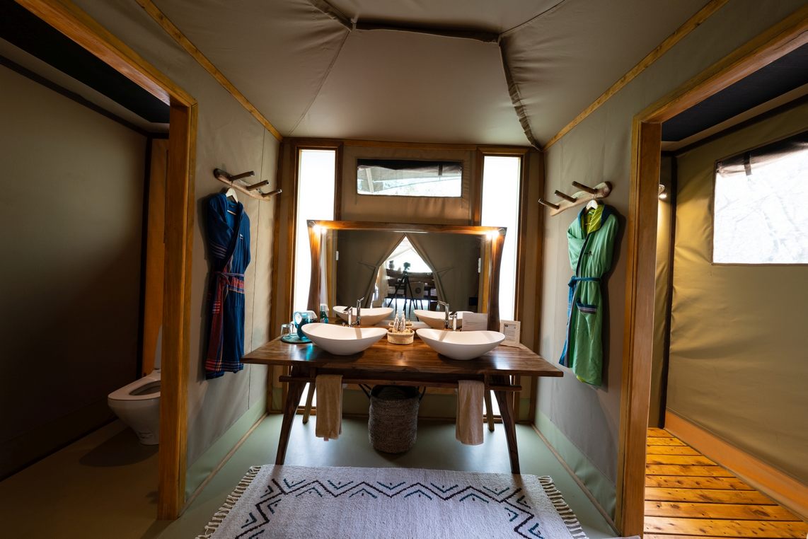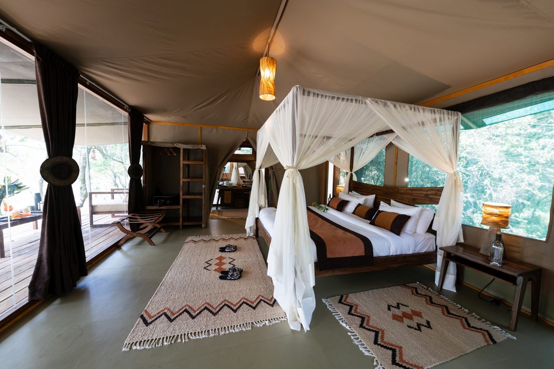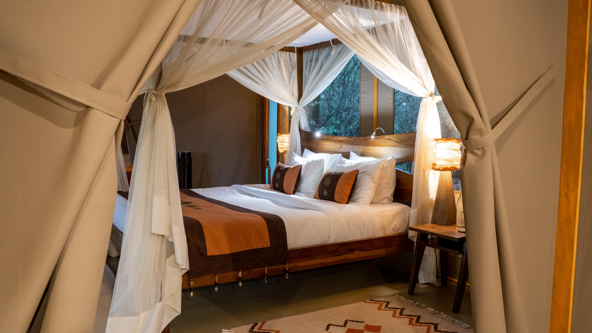 Alle Gästezelte sind mit bequemen Himmelbetten, Moskitonetzen, Badezimmern (WC, Duschen mit Warm- & Kaltwasser), Schreibtisch und privater Veranda ausgestattet und bieten besten Komfort. Das Familien-Zelt besteht aus 2 Zimmern mit eigenem Bad und gemeinsamen Wohnzimmer.