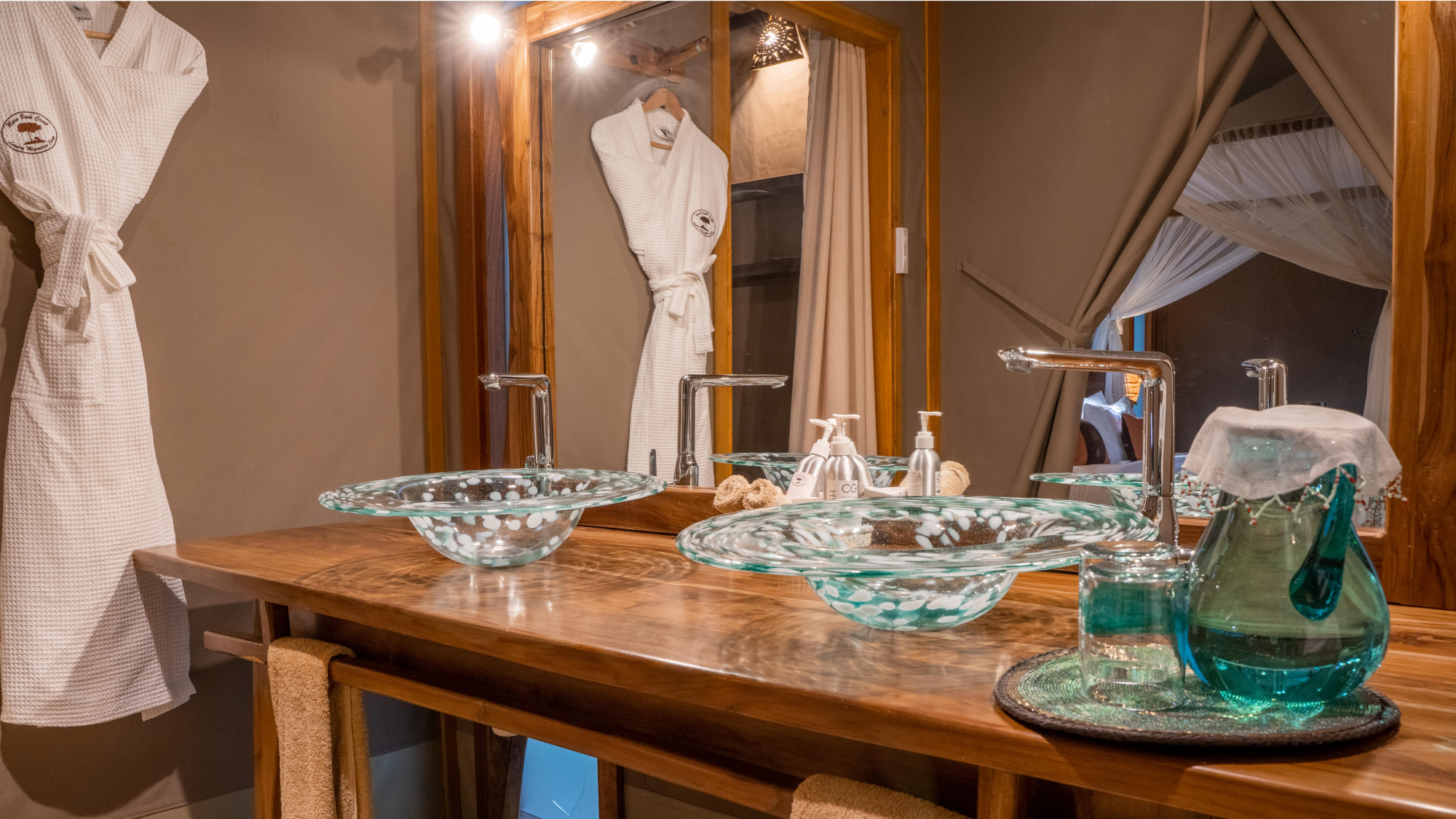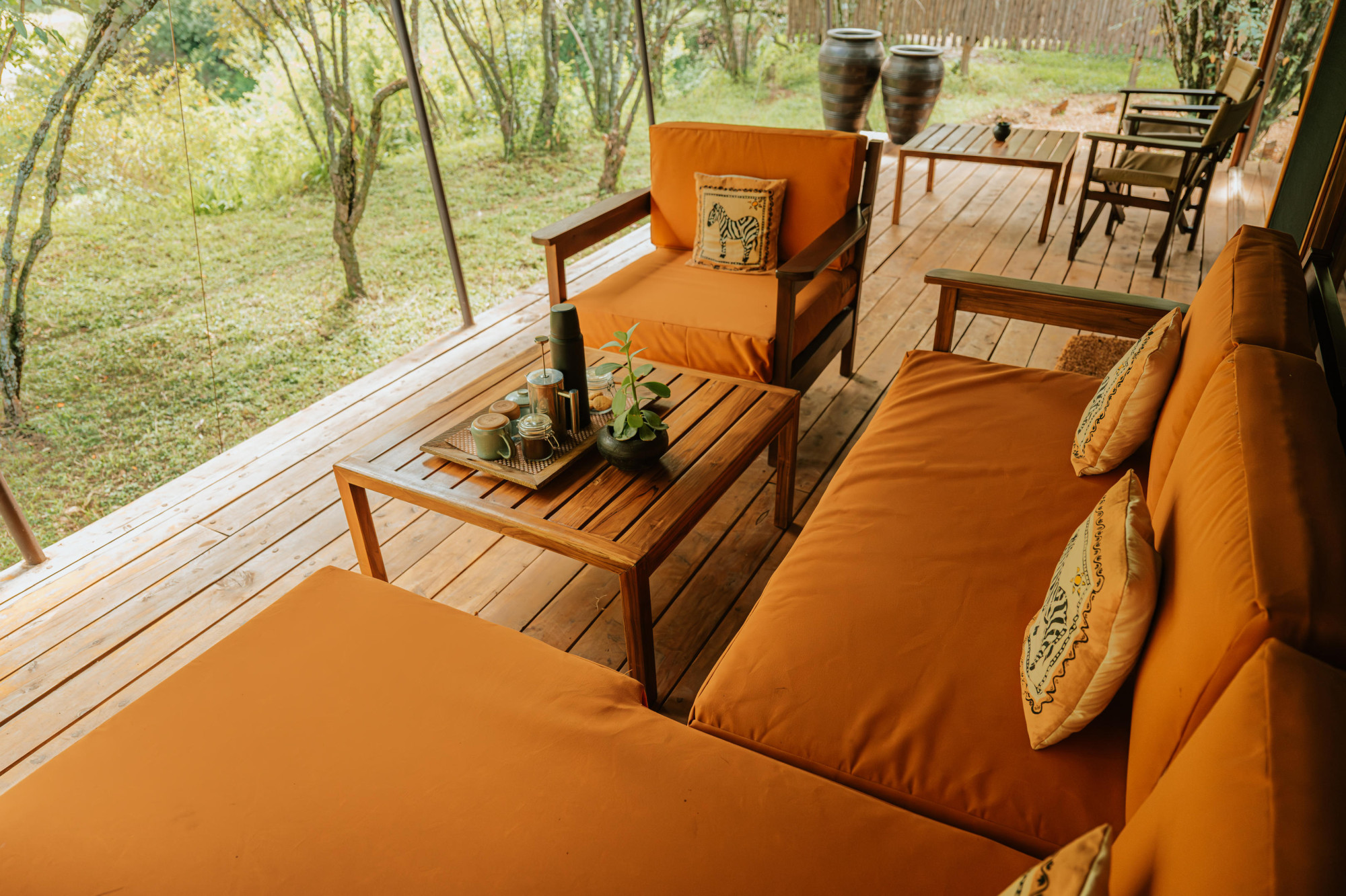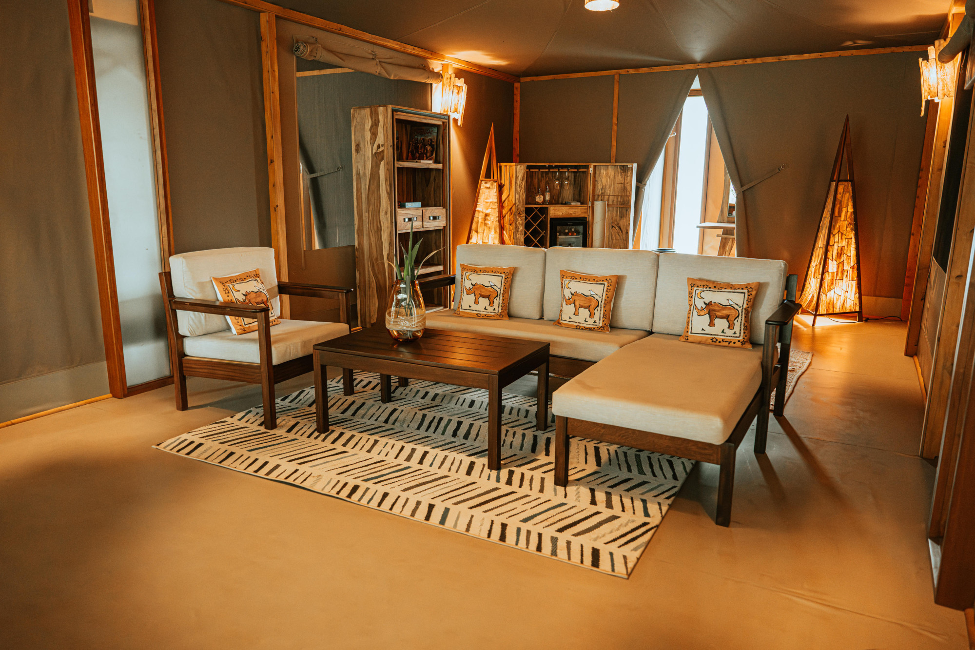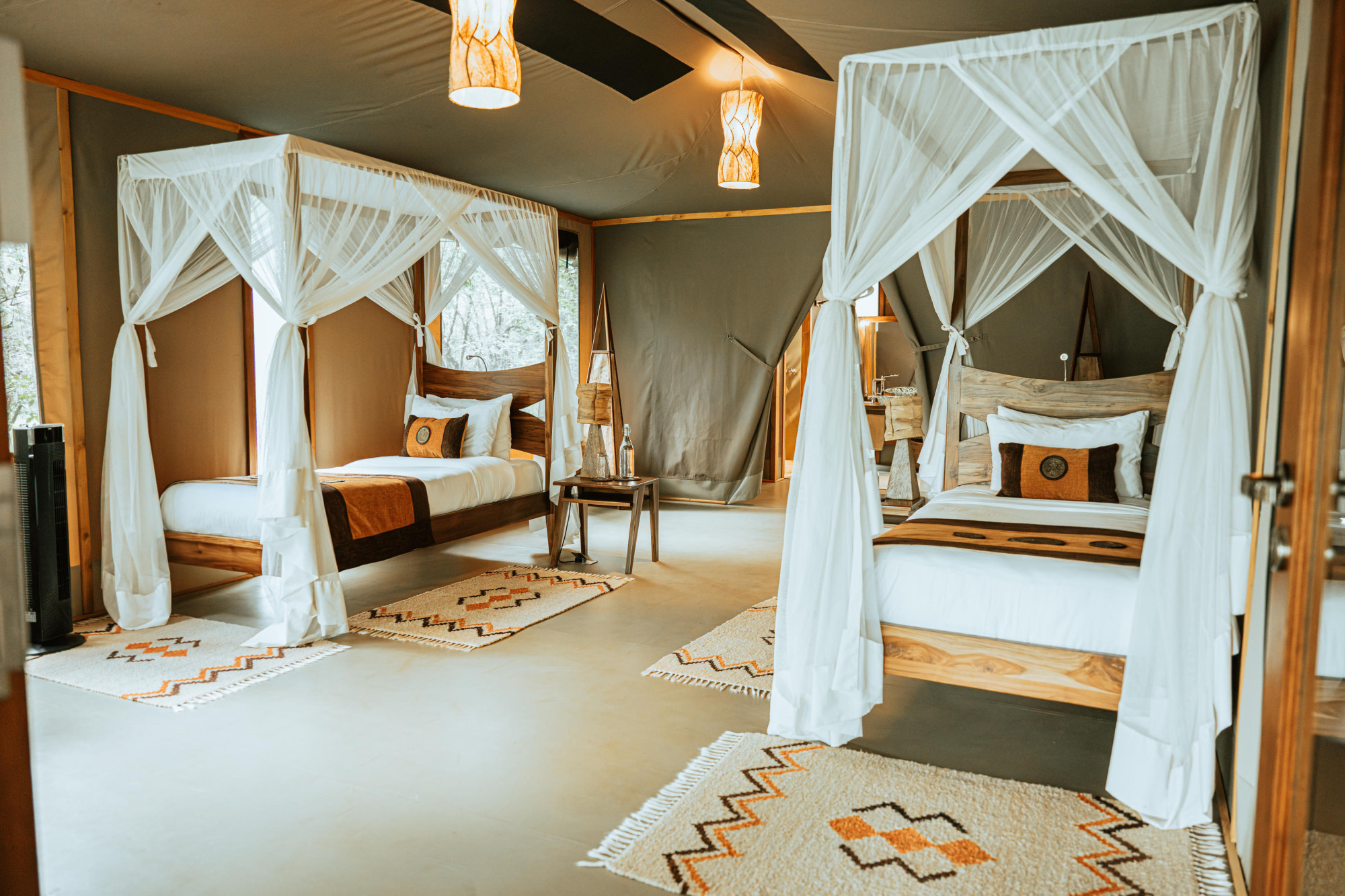 Alle Gästezelte sind mit bequemen Himmelbetten, Moskitonetzen, Badezimmern (WC, Duschen mit Warm- & Kaltwasser), Schreibtisch und privater Veranda ausgestattet und bieten besten Komfort. Das Familien-Zelt besteht aus 2 Zimmern mit eigenem Bad und gemeinsamen Wohnzimmer.