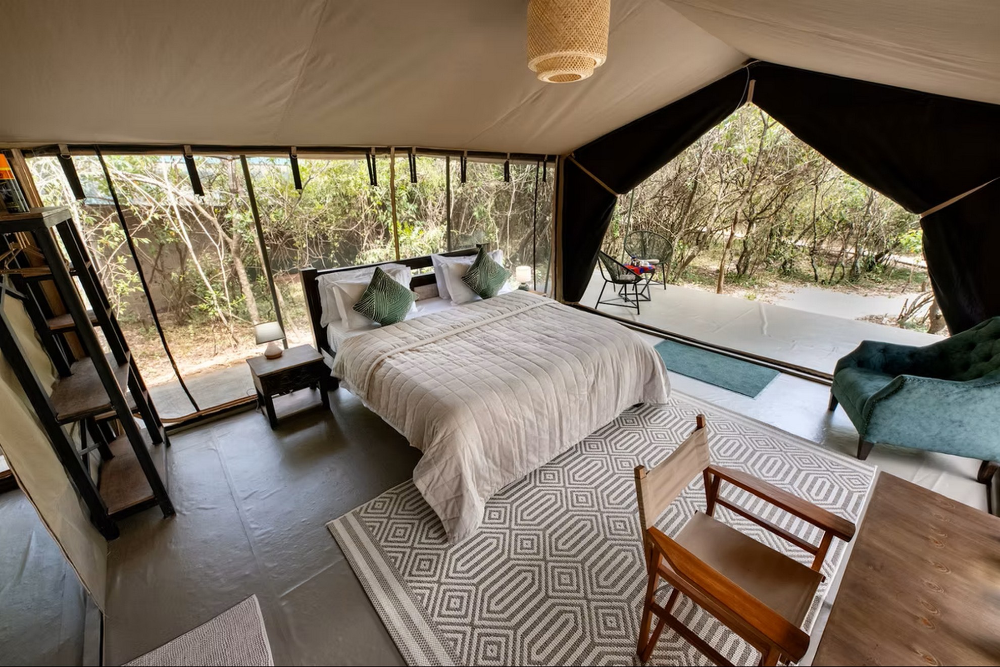 Das Olkinyei Mara Tented Camp bietet verschiedene Zeltkategorien – von funktional bis besonders komfortabel. Die Deluxe Zelte überzeugen mit großzügigem Platzangebot, bequemen Doppel- oder Einzelbetten, Moskitonetzen, einem privaten Badezimmer mit Dusche und WC sowie einer eigenen Terrasse mit Sitzgelegenheiten. Noch etwas exklusiver sind die neuen Premium Zelte. Sie bieten ein aufgewertetes Raumgefühl, stilvolle Sessel, hochwertige Holzmöbel und dekorative Details wie Teppiche oder kunstvolle Stoffe. Große Panoramafenster ermöglichen euch einen ungestörten Blick in die Wildnis – manchmal direkt auf vorbeiziehende Tiere. WLAN steht kostenlos zur Verfügung.