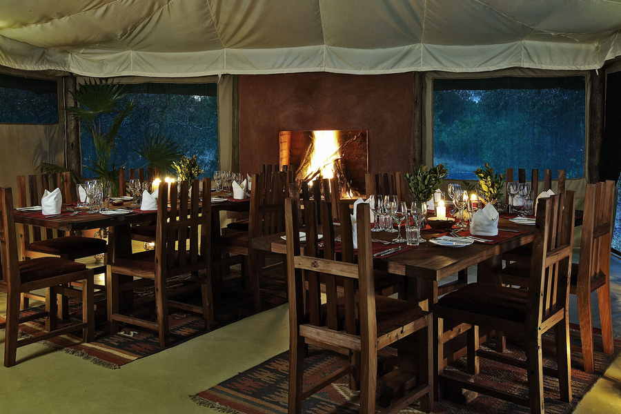 Eine geräumig Lounge und ein Speisezelt mit wohlig wärmenden Kaminen schaffen eine stilvolle und doch sehr naturnahe Atmosphäre.
