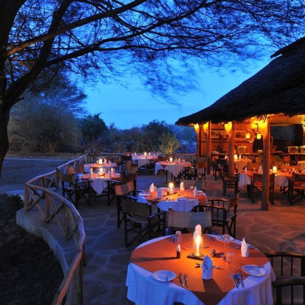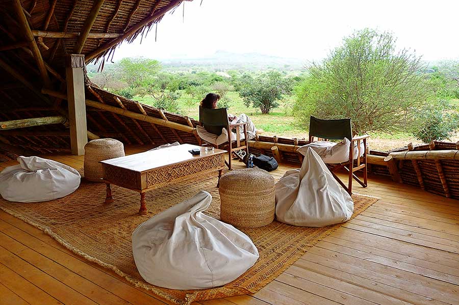 Die Ausstattung des Camps: Das Camp besteht aus einem Gemeinschaftszelt mit Ess- und Aufenthaltsraum und einem Obergeschoß, von dem aus man die spektakuläre Sicht auf den Park genießen kann. Das Camp ist landestypisch und rustikal eingerichtet, mit Galana-Stein-Böden und Strohdächern. Es gibt 3 - 4 Schlafzelte mit Doppelbetten und angeschlossenem Badezimmer. Die Bäder sind nach oben offen, es gibt fließendes Heiß- und Kaltwasser und eine Toilette mit Spülung.