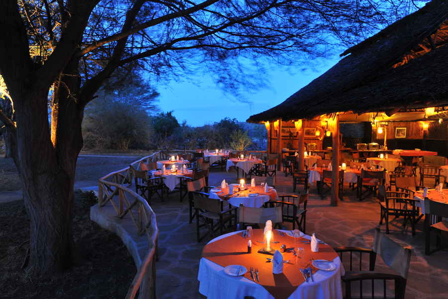 Der Speisebereich begeistert mit Blick auf die Satao-Oase, wo Gäste unter einem jahrhundertealten Tamarindenbaum dinieren und dabei Elefanten beim Trinken beobachten können. Ein besonderes Highlight ist der stimmungsvolle Sundowner am Lagerfeuer, bei dem Sie bei einem Cocktail den afrikanischen Sonnenuntergang genießen – ein unvergesslicher Moment inmitten der Wildnis.