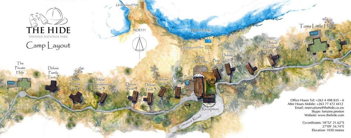 In einer privaten Konzession, aber innerhalb des Hwange-Nationalparks an der Ostgrenze, bietet The Hide eine unglaubliche Vielfalt an Wildtieren und Landschaften. The Hide bietet eine Reihe von Unterkünften für Reisenden und kombiniert Natur und Luxus auf hohem Niveau. Das Camp bietet Platz für bis zu 20 Gäste in 10 komfortablen und geräumigen Deluxe-, Familien-Deluxe- und Flitterwochen-Deluxe-Zelten. Die Zelte haben verschiedene Konfigurationen mit Badewannen und Duschen im Innen- und/oder Außenbereich. Jedes Zelt verfügt über eine private Veranda, von wo aus die Gäste das Kommen und Gehen einer großen Vielfalt an Wild am Wasserloch beobachten können.