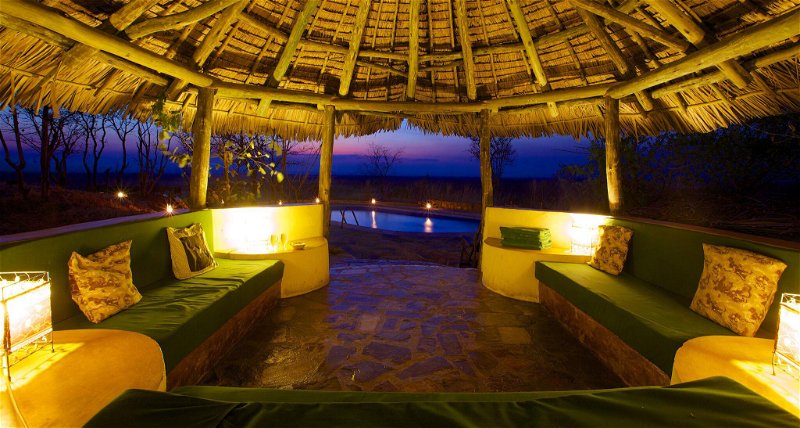 Das Hauptgebäude schmiegt sich direkt an den Hügel und bietet eine beeindruckende 360-Grad-Rundumsicht über die Mkata-Ebene. Ein Swimmingpool sorgt an heißen Tagen für erfrischende Abkühlung. Bar und Speisebereich schaffen eine angenehme Atmosphäre für gesellige Momente und den Austausch mit anderen Gästen. Eine nahegelegene Wasserstelle zieht regelmäßig Wildtiere an und ermöglicht spannende Beobachtungen auch abseits der Pirschfahrten.