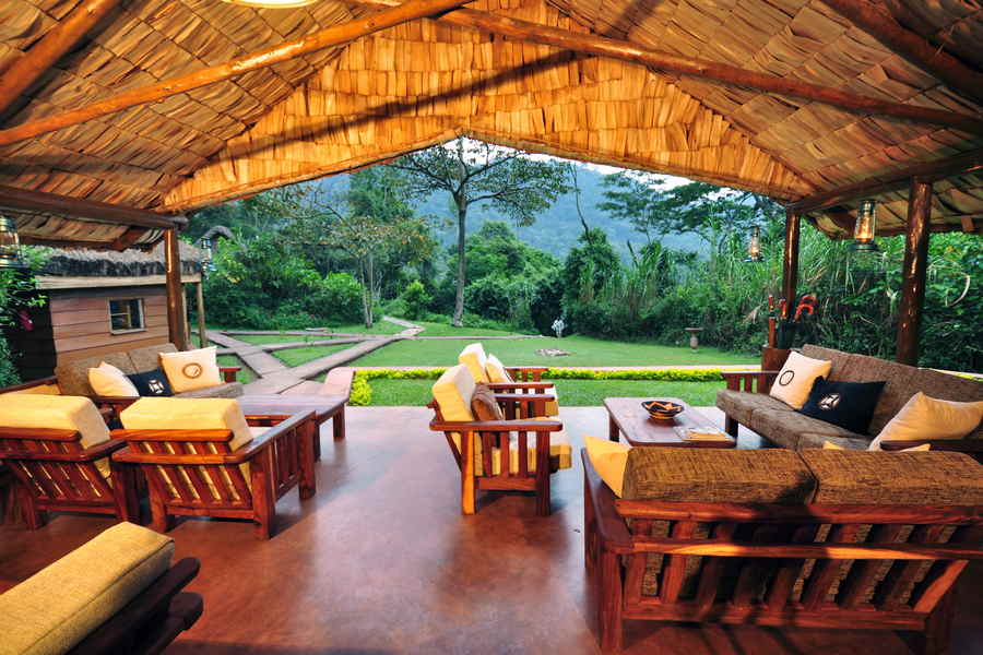 Das Herz der Lodge bildet der offene Indoor-Outdoor-Lounge- und Restaurantbereich mit Blick in den Regenwald. Am Abend sorgen Campfire-Atmosphäre, Sundowner und gelegentlich traditionelle Musik für eine besonders intime Stimmung, in der Gäste ihre Gorilla-Erlebnisse teilen. Ergänzt wird das Angebot durch ein Spa, eine Boutique mit lokal gefertigten Produkten sowie die Explorer’s Lounge, in der Karten, Bücher und Informationen zur Flora, Fauna und Kultur Ugandas bereitstehen.