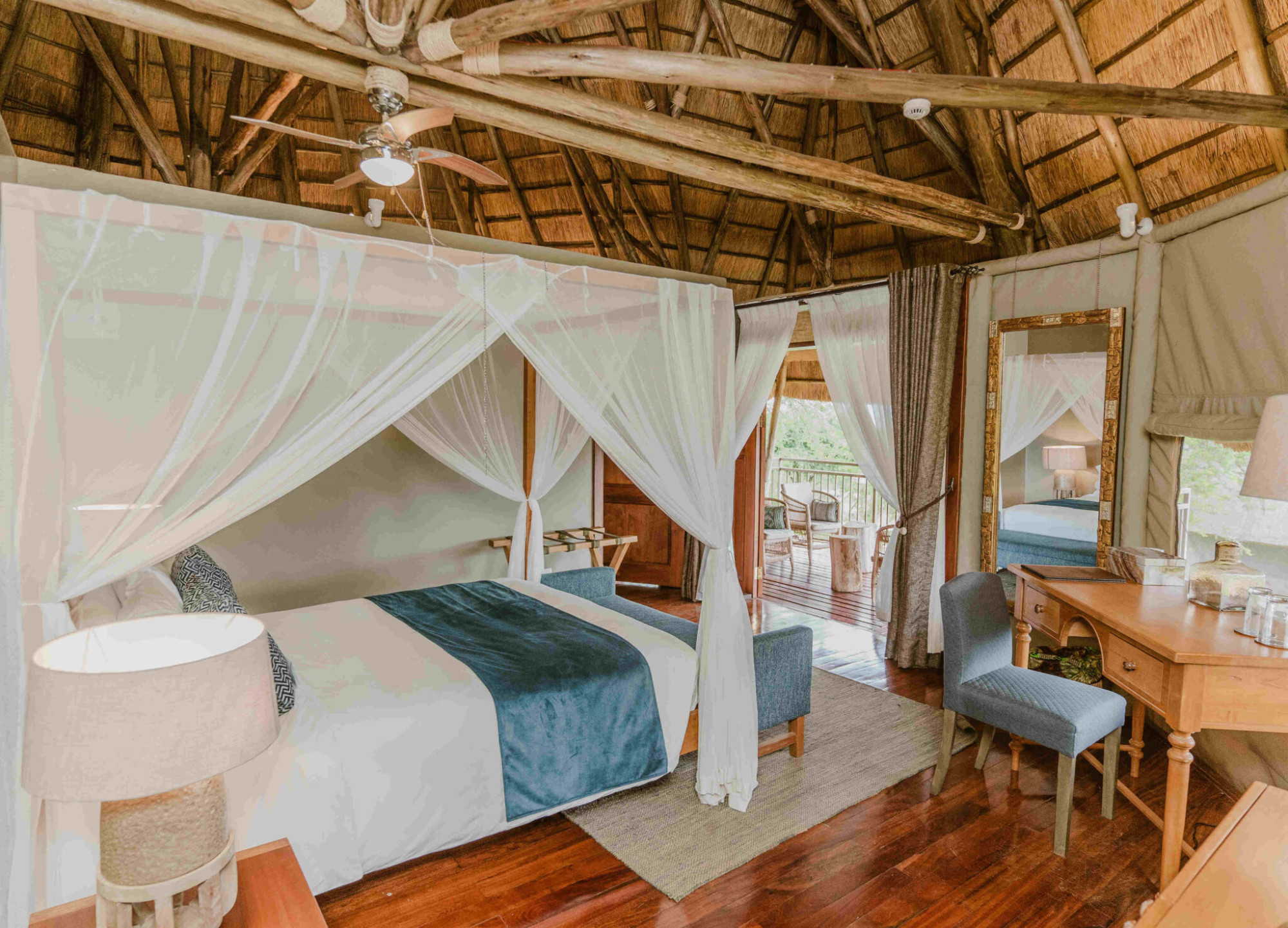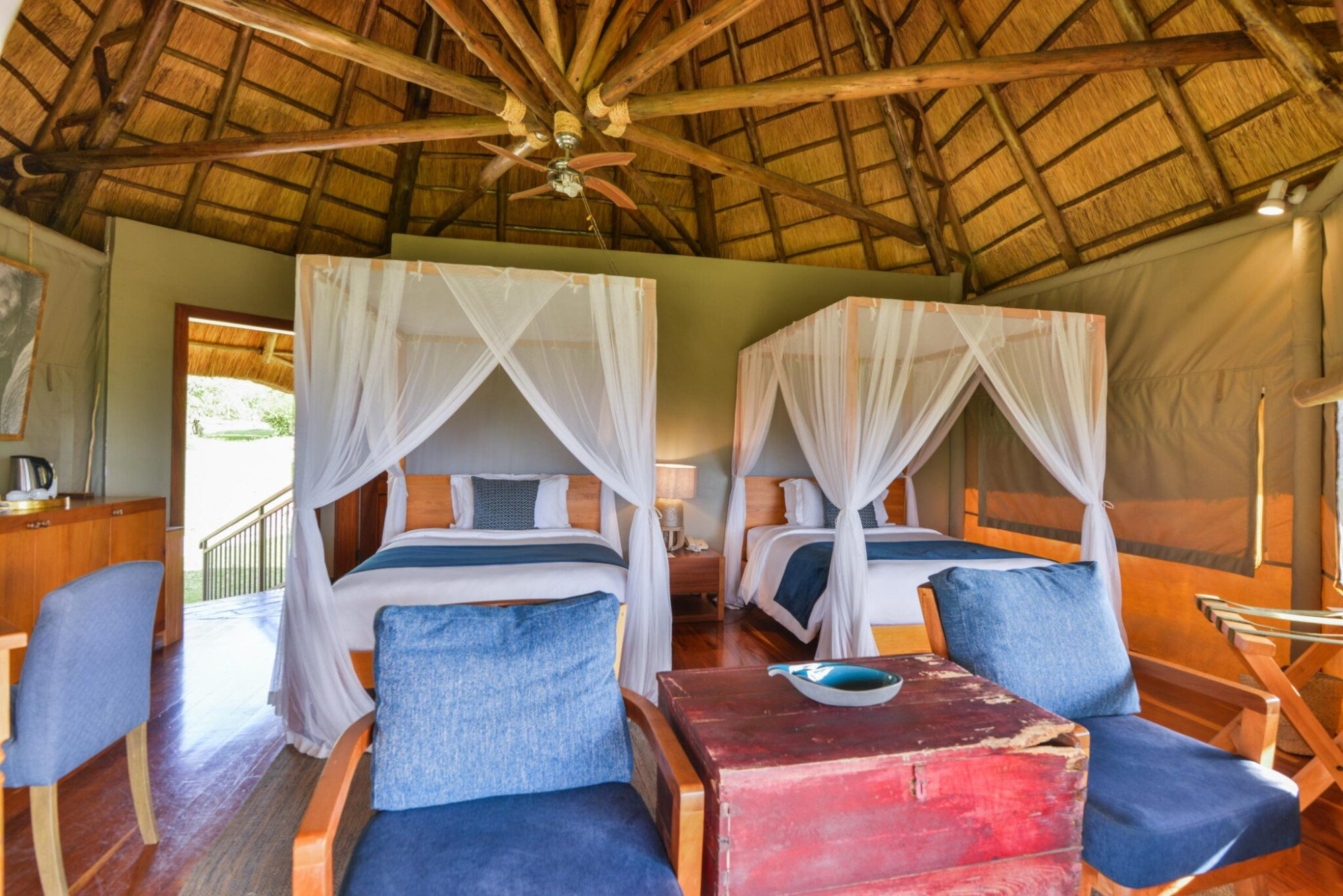 Die Lodge verfügt über 9 Deluxe Bandas, 2 Family Bandas und 1 Honeymoon Banda. Die Deluxe Bandas sind mit Doppel- oder Twin-Betten ausgestattet und eignen sich für Paare oder Freunde, während die Family Bandas mit zwei Schlafzimmern ideal für Familien oder kleine Gruppen sind. Die Honeymoon Banda bietet Paaren besondere Privatsphäre in ruhiger Lage. Alle Bandas sind en-suite, komfortabel eingerichtet und verfügen über Moskitonetze, gemütliche Sitzbereiche und eine private Veranda. Natürliche Materialien, warme Erdtöne und lokale Kunst schaffen eine entspannte Atmosphäre, ergänzt durch Ausblicke auf See, Savanne oder Akazienlandschaft.