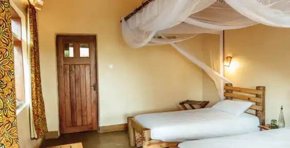 Im offen gestalteten Hauptgebäude befinden sich das Restaurant und die Bar, die nicht nur durch ihre Aussicht, sondern auch durch ihre Küche überzeugen. Serviert werden ugandische Gerichte mit westlichen Einflüssen, frisch zubereitet und liebevoll präsentiert. Ergänzt wird das Lodge-Erlebnis durch einen Swimmingpool mit Aussicht, gemütliche Sitzbereiche sowie eine Lagerfeuerstelle, an der Gäste abends unter dem afrikanischen Sternenhimmel zusammenkommen.