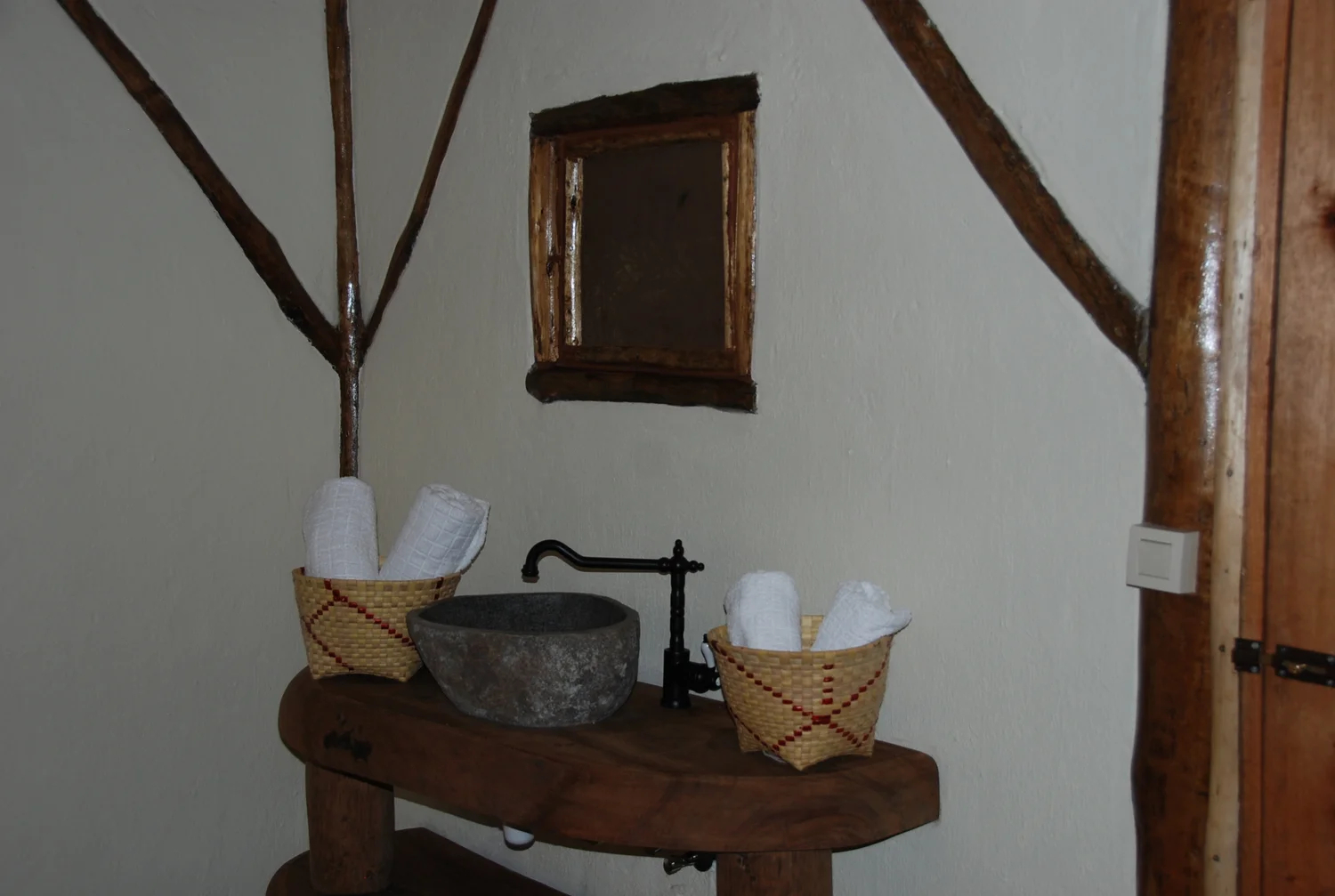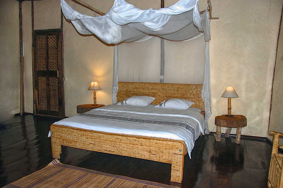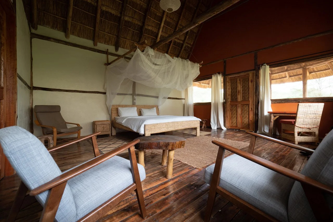 Diese charmanten, reetgedeckten Cottages verfügen jeweils über ein privates en-suite Badezimmer mit Warm- und Kaltwasser sowie Outdoor-Dusche. Vier Cottages liegen eingebettet in üppiger Vegetation und sind über erhöhte Holzstege erreichbar, drei weitere blicken auf offenes Grasland, das regelmäßig von Wildtieren besucht wird. Alle Cottages bieten eine großzügige Veranda mit Sitzgelegenheiten.