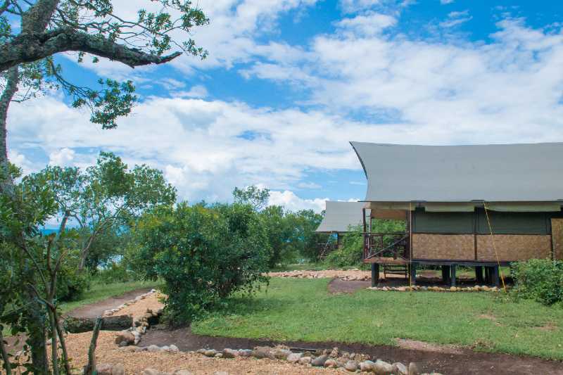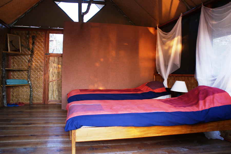 Die 10 einfachen Zelte sind eine budgetfreundliche Option für naturverbundene Reisende. Sie sind mit bequemen Betten, Nachttisch und Stromanschluss ausgestattet und stehen unter einem grasgedeckten Dach, das Schatten und Privatsphäre bietet. Diese Zelte teilen sich gemeinschaftliche Sanitäranlagen mit Duschen und Spültoiletten. Bettwäsche und Handtücher werden gestellt.