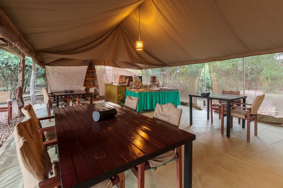 Zentraler Treffpunkt der Lodge ist das großzügige Restaurant- und Barzelt, das erhöht liegt und einen beeindruckenden Blick auf den Kazinga-Kanal sowie die Rwenzori-Bergkette bietet. Hier werden Frühstück, Mittag- und Abendessen serviert. Abends – wenn es das Wetter erlaubt – finden stimmungsvolle Dinner unter freiem Himmel statt, begleitet von Paraffinlichtern und einer Feuerstelle, die für eine besondere Atmosphäre sorgen. Aufgrund der abgelegenen Lage wird mit festen Menüs gearbeitet; spezielle Ernährungswünsche werden bei rechtzeitiger Anmeldung gerne berücksichtigt. Frühaufsteher können sich Kaffee, Tee oder Lunchpakete für Safaris organisieren lassen.