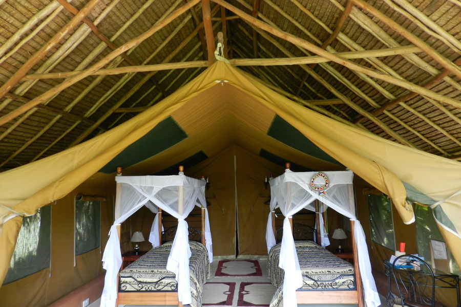 Die 25 Safarizelte sind mit einem Dach aus Stroh und Naturmaterialien geschützt. Dies schafft auch an heißen Tagen immer eine angenehme Temperatur in den Zelten. Zweckmäßig und mit Liebe zum Detail eingerichtet bieten Sie alles was man auf Safari benötigt. Die Doppelbetten oder auch bis zu drei Einzelbetten sind mit Moskitonetzen geschützt. Das en-suite Badezimmer und eine private Terrasse runden die Einrichtungen der Zelte ab. Ebenfalls steht elektrischer Strom in den Zelten zur Verfügung
