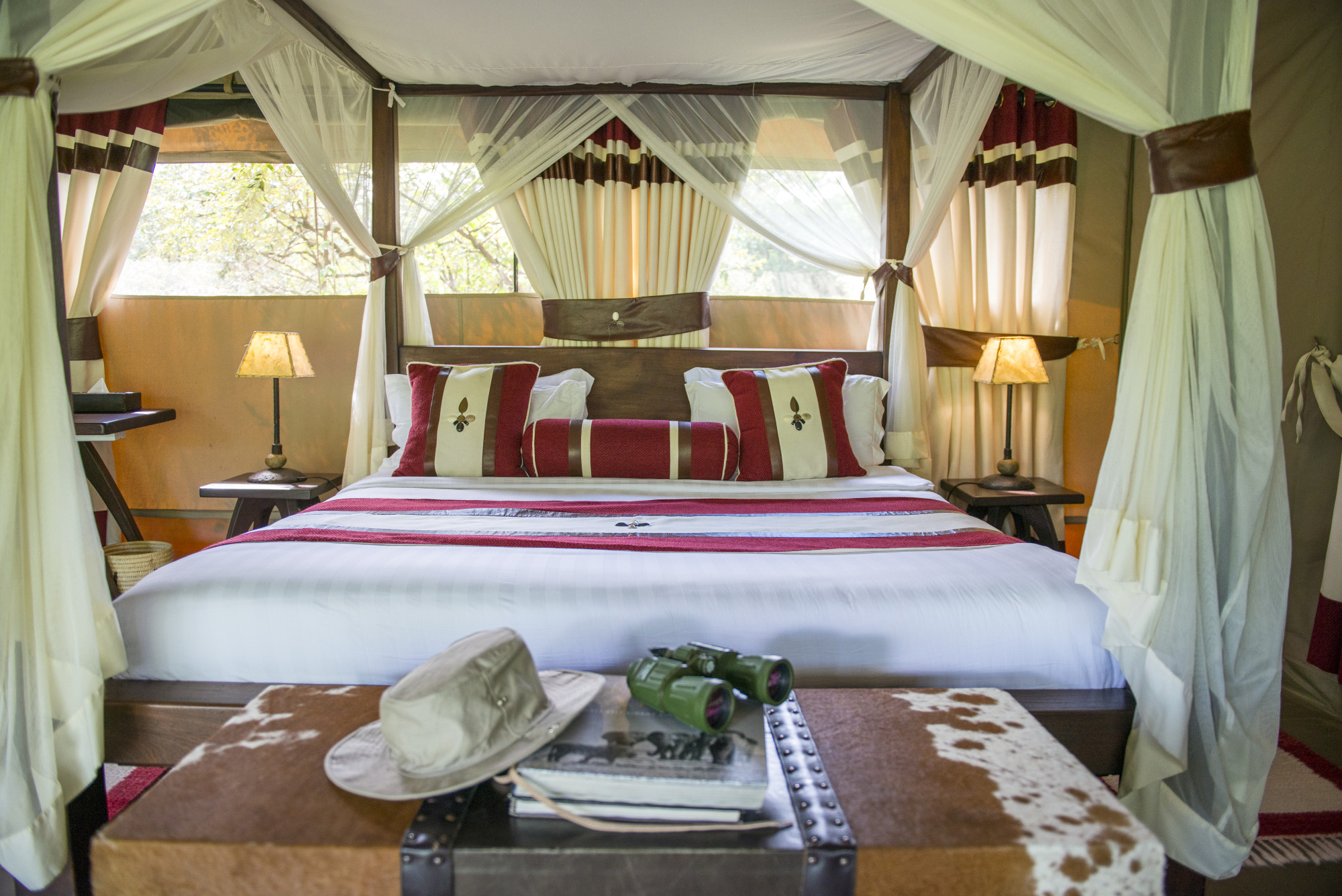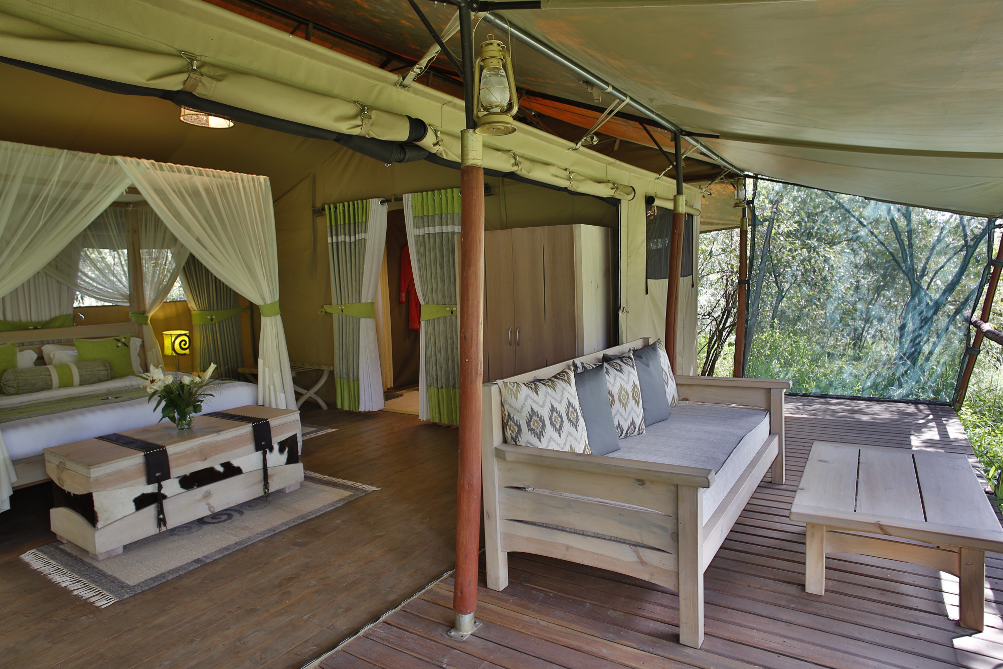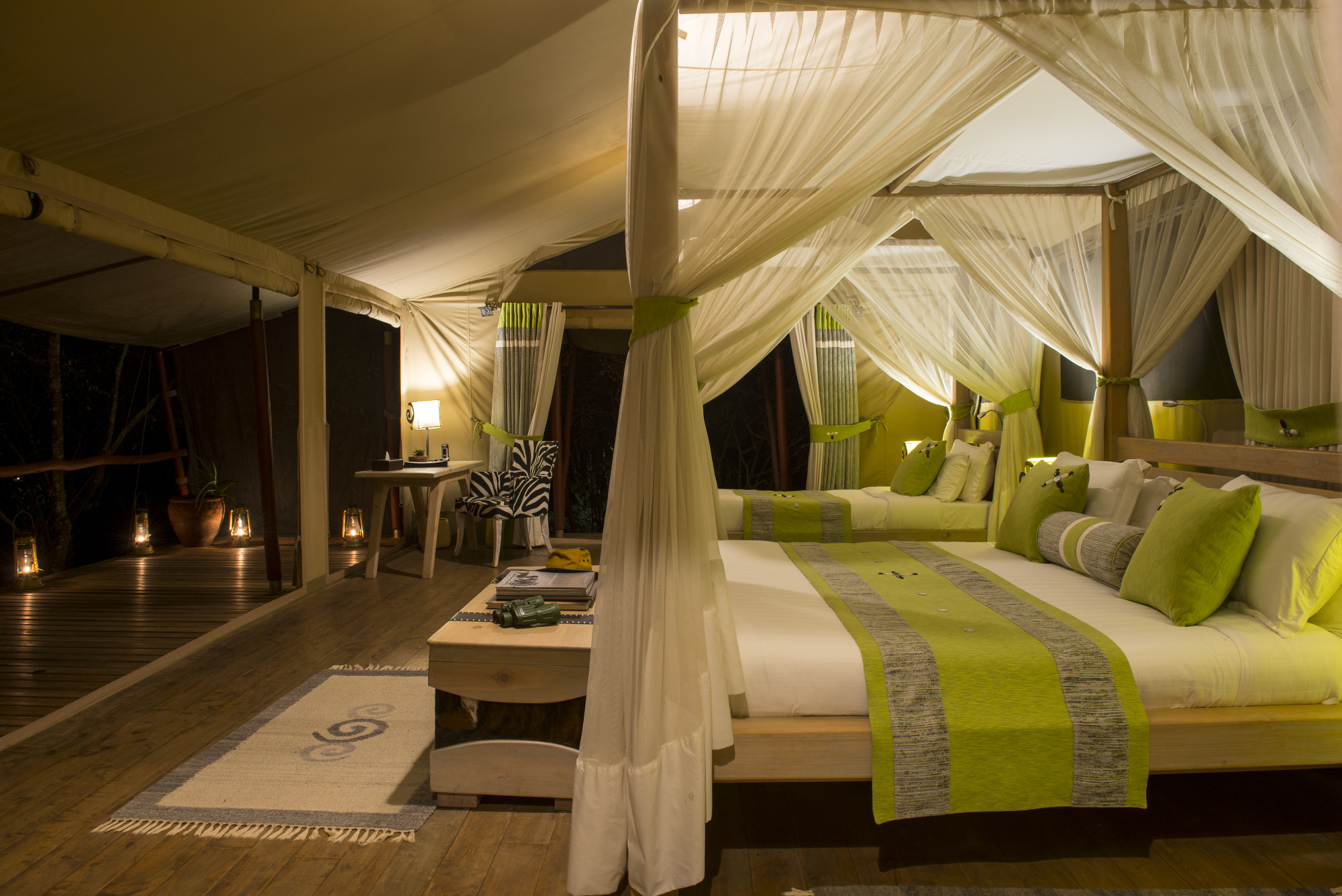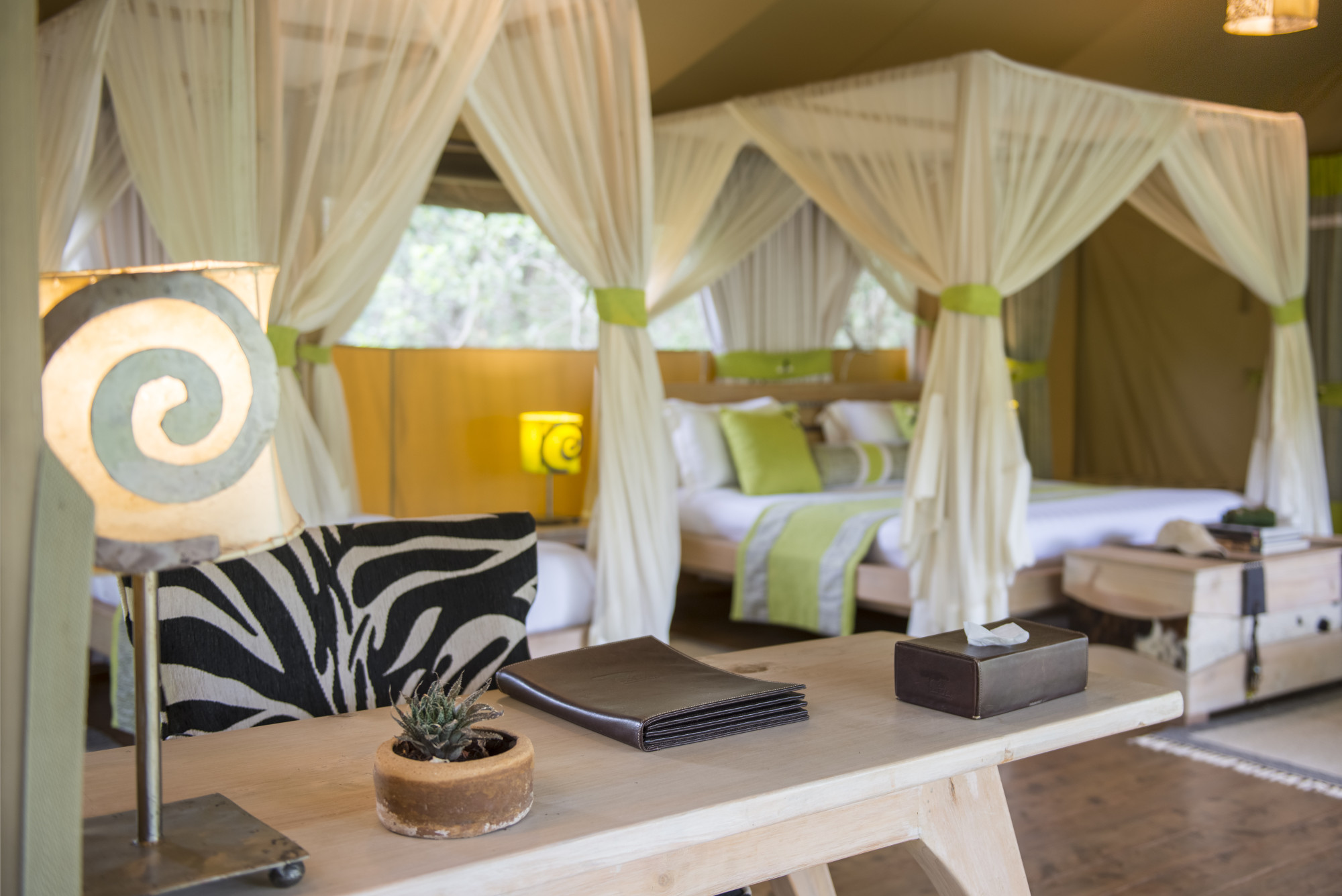Alle Gästezelte sind mit lokal gefertigten Möbeln ausgestattet und bieten besten Komfort eines Bush Camps. Sie sind sehr großzügig geschnitten und verfügen neben dem Schlaf/Wohnbereich über Badezimmer mit separater Toilette und Dusche und auch über eine überdachte Veranda. Luxus inmitten der Wildnis Afrikas. Es stehen ebenfalls 2 Familien Zelte seinen Gästen zur Verfügung. Dabei gibt es getrennte Schlafbereiche für Eltern und Kinder.