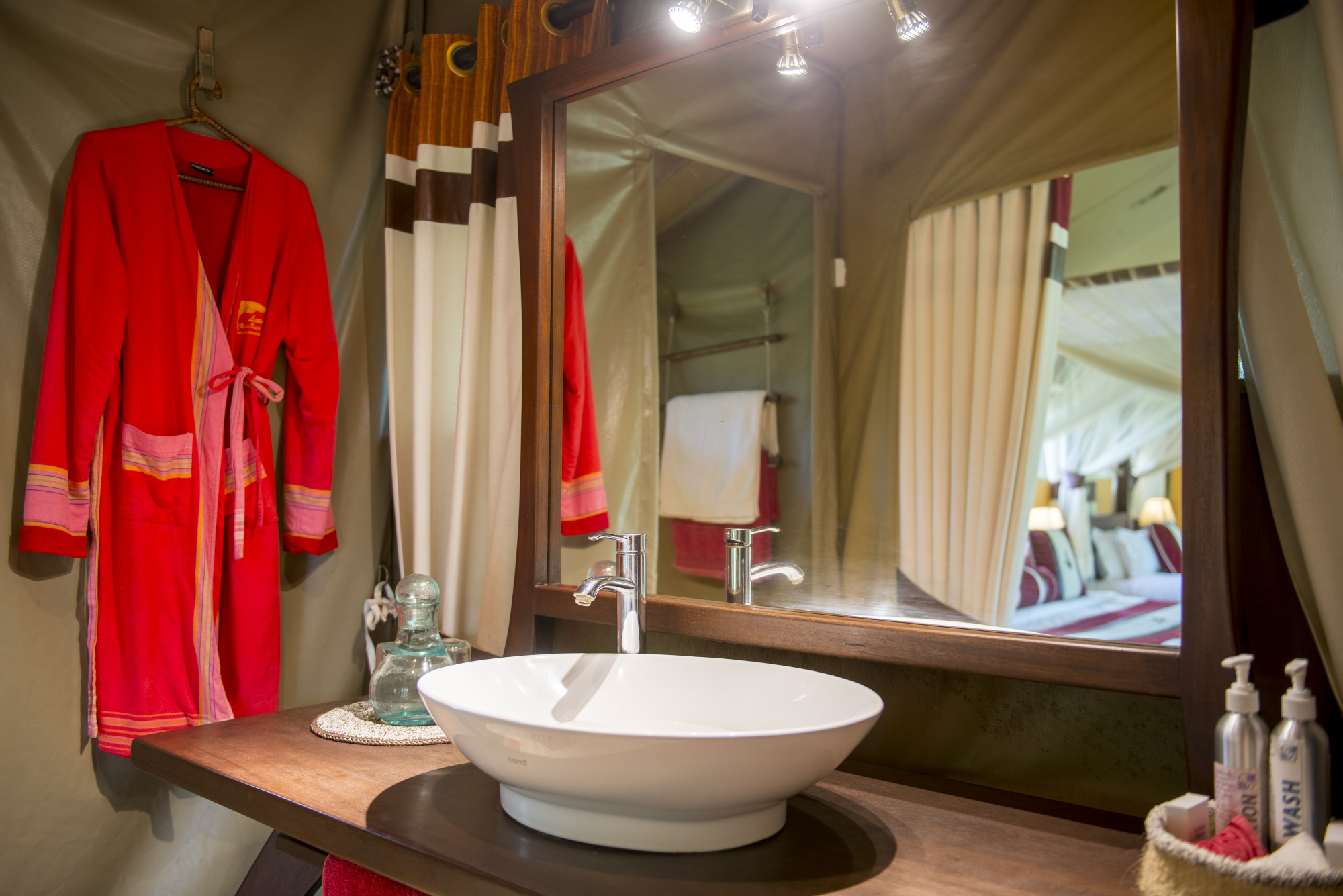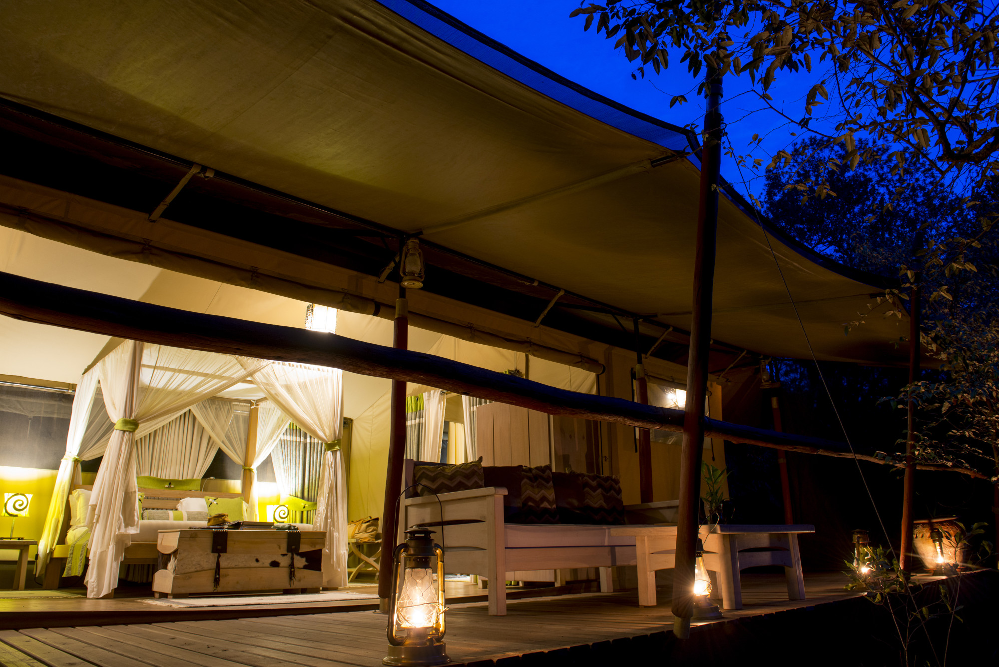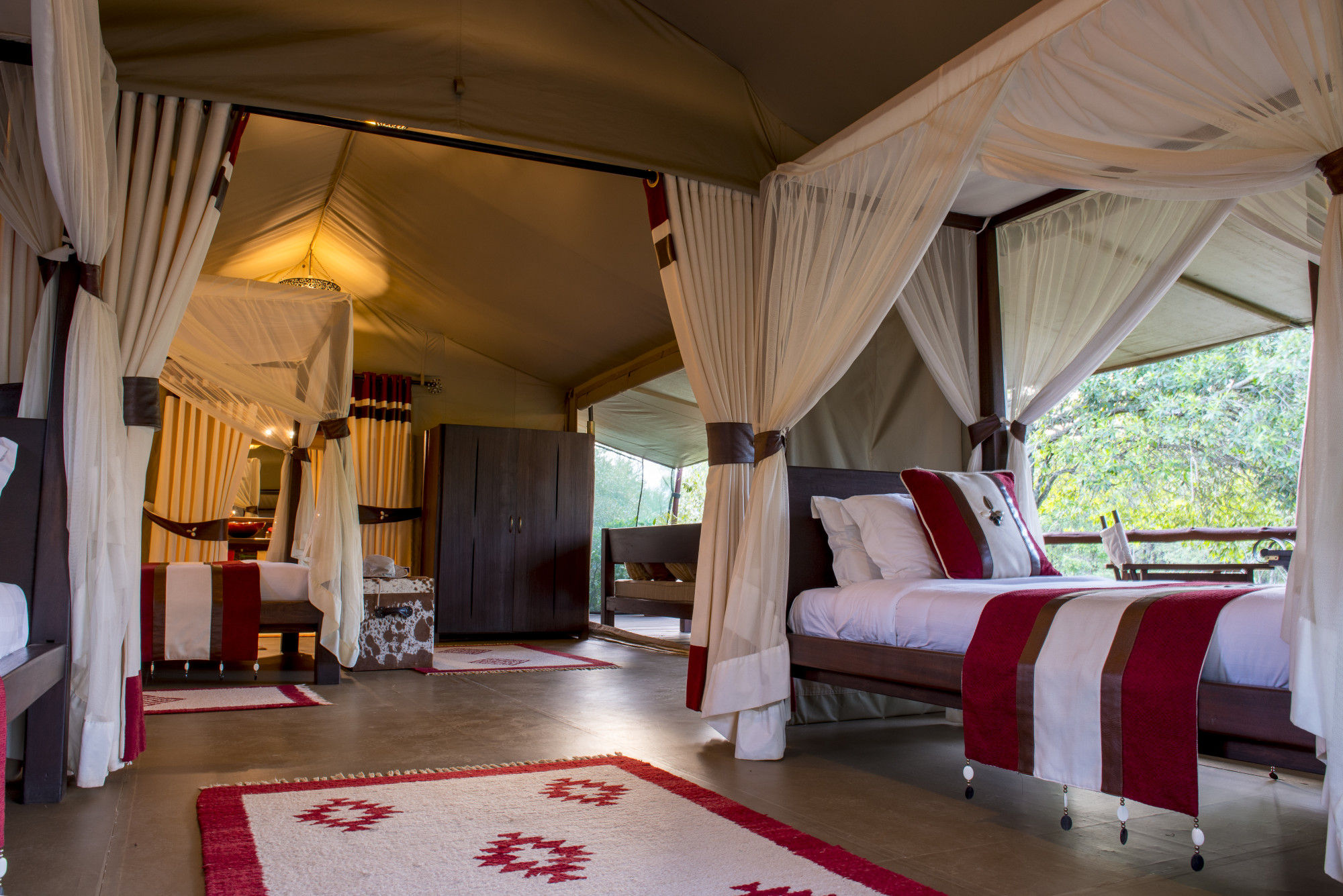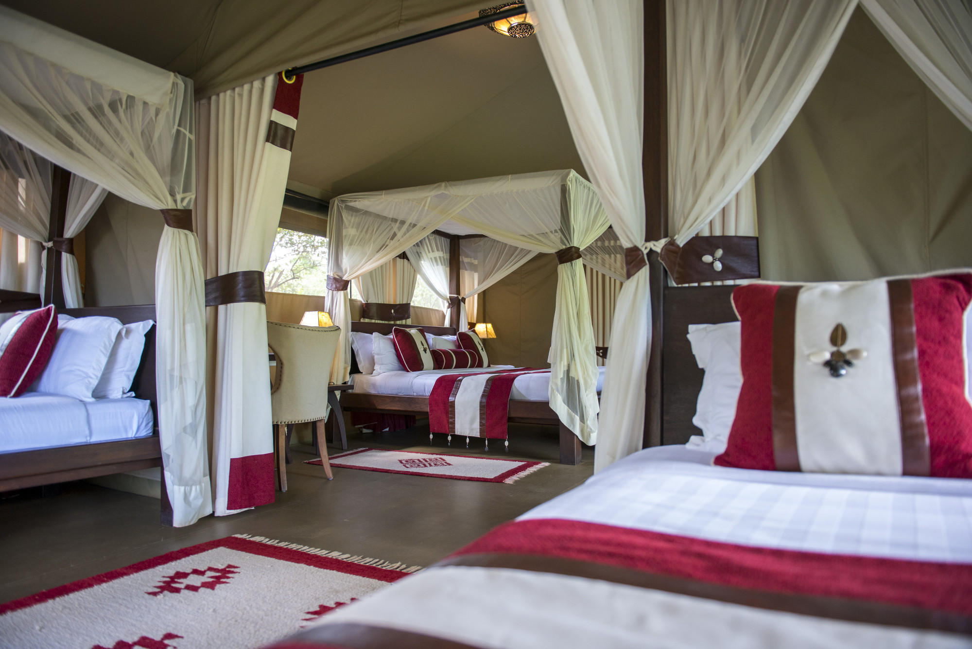 Alle Gästezelte sind mit lokal gefertigten Möbeln ausgestattet und bieten besten Komfort eines Bush Camps. Sie sind sehr großzügig geschnitten und verfügen neben dem Schlaf/Wohnbereich über Badezimmer mit separater Toilette und Dusche und auch über eine überdachte Veranda. Luxus inmitten der Wildnis Afrikas. Es stehen ebenfalls 2 Familien Zelte seinen Gästen zur Verfügung. Dabei gibt es getrennte Schlafbereiche für Eltern und Kinder.