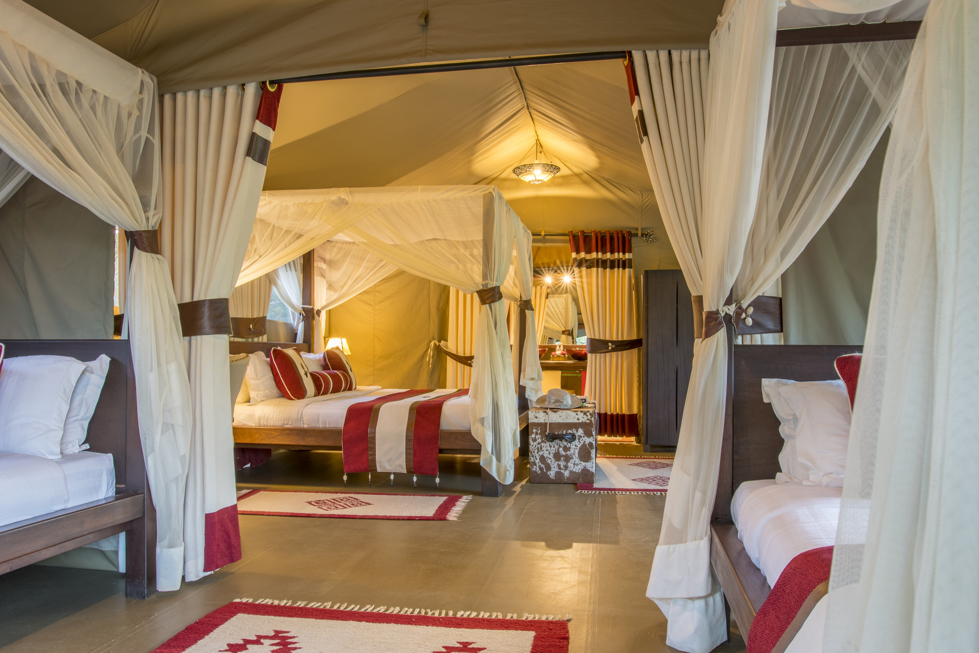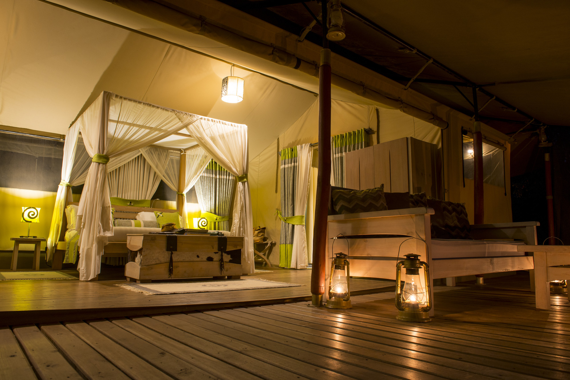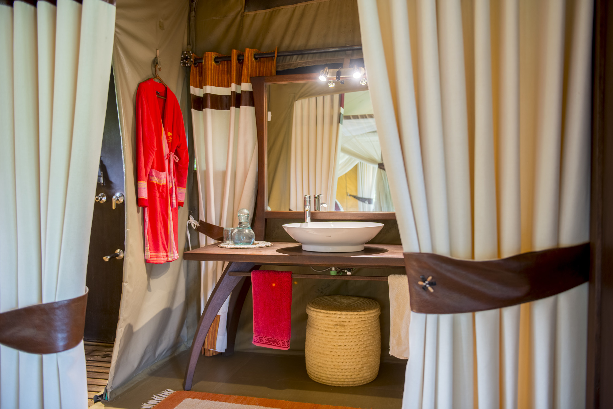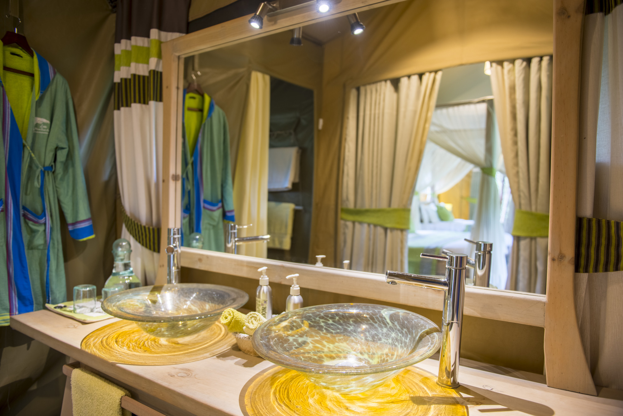 Alle Gästezelte sind mit lokal gefertigten Möbeln ausgestattet und bieten besten Komfort eines Bush Camps. Sie sind sehr großzügig geschnitten und verfügen neben dem Schlaf/Wohnbereich über Badezimmer mit separater Toilette und Dusche und auch über eine überdachte Veranda. Luxus inmitten der Wildnis Afrikas. Es stehen ebenfalls 2 Familien Zelte seinen Gästen zur Verfügung. Dabei gibt es getrennte Schlafbereiche für Eltern und Kinder.