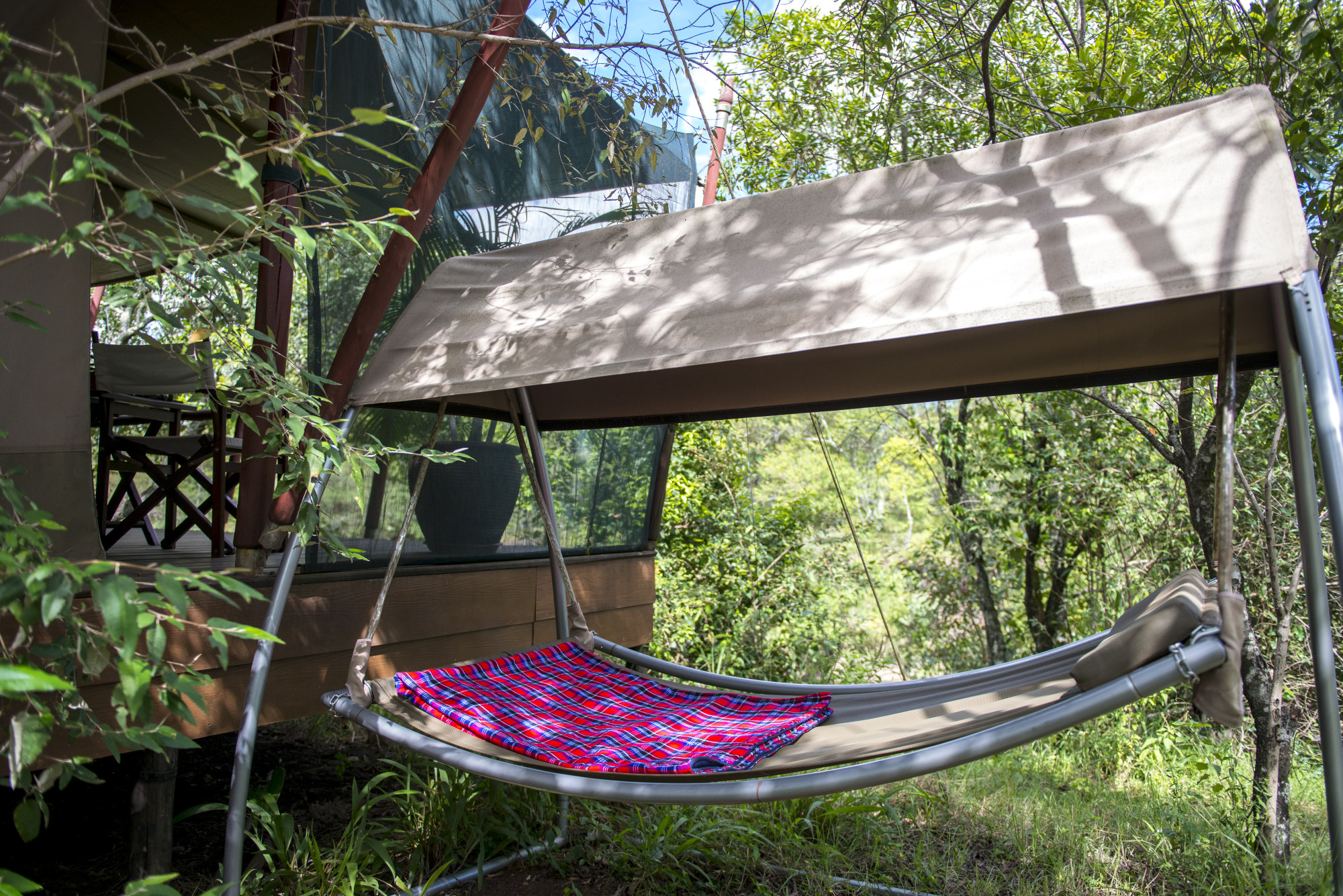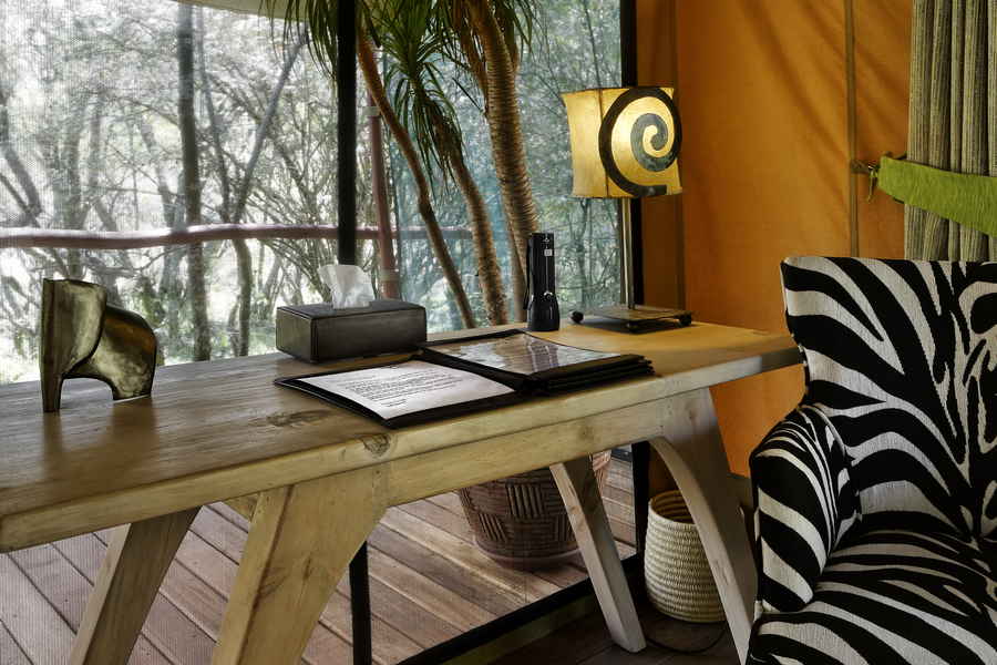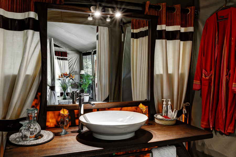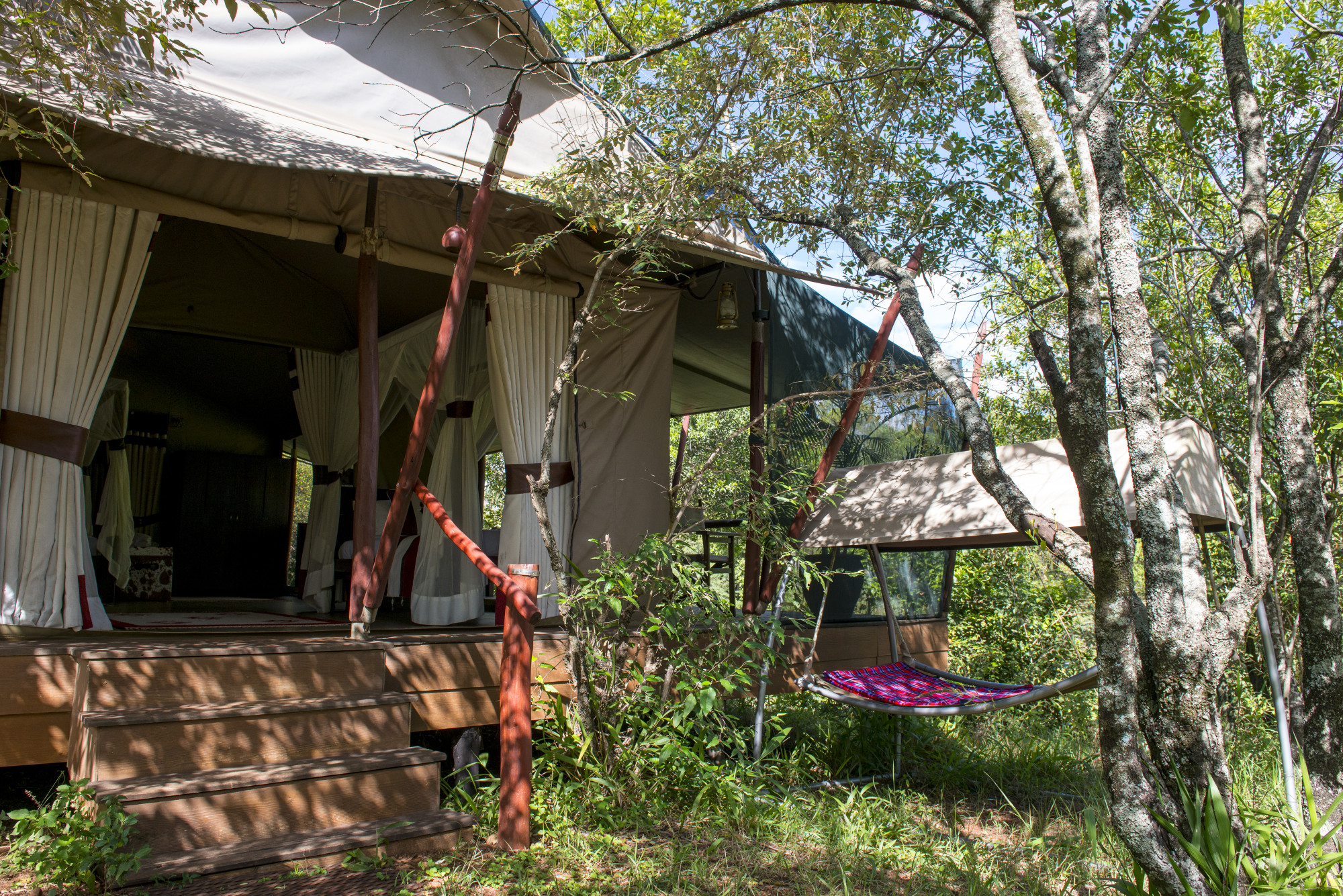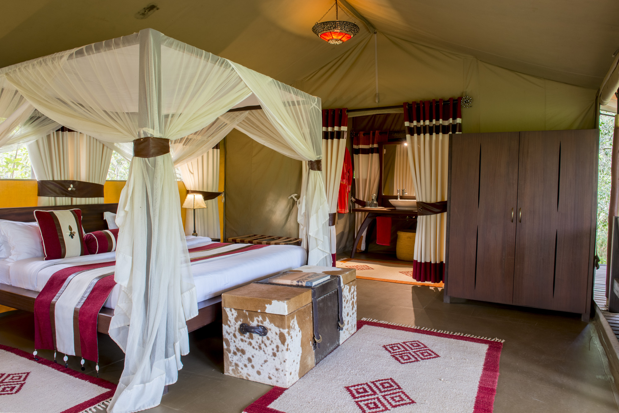 Alle Gästezelte sind mit lokal gefertigten Möbeln ausgestattet und bieten besten Komfort eines Bush Camps. Sie sind sehr großzügig geschnitten und verfügen neben dem Schlaf/Wohnbereich über Badezimmer mit separater Toilette und Dusche und auch über eine überdachte Veranda. Luxus inmitten der Wildnis Afrikas. Es stehen ebenfalls 2 Familien Zelte seinen Gästen zur Verfügung. Dabei gibt es getrennte Schlafbereiche für Eltern und Kinder.