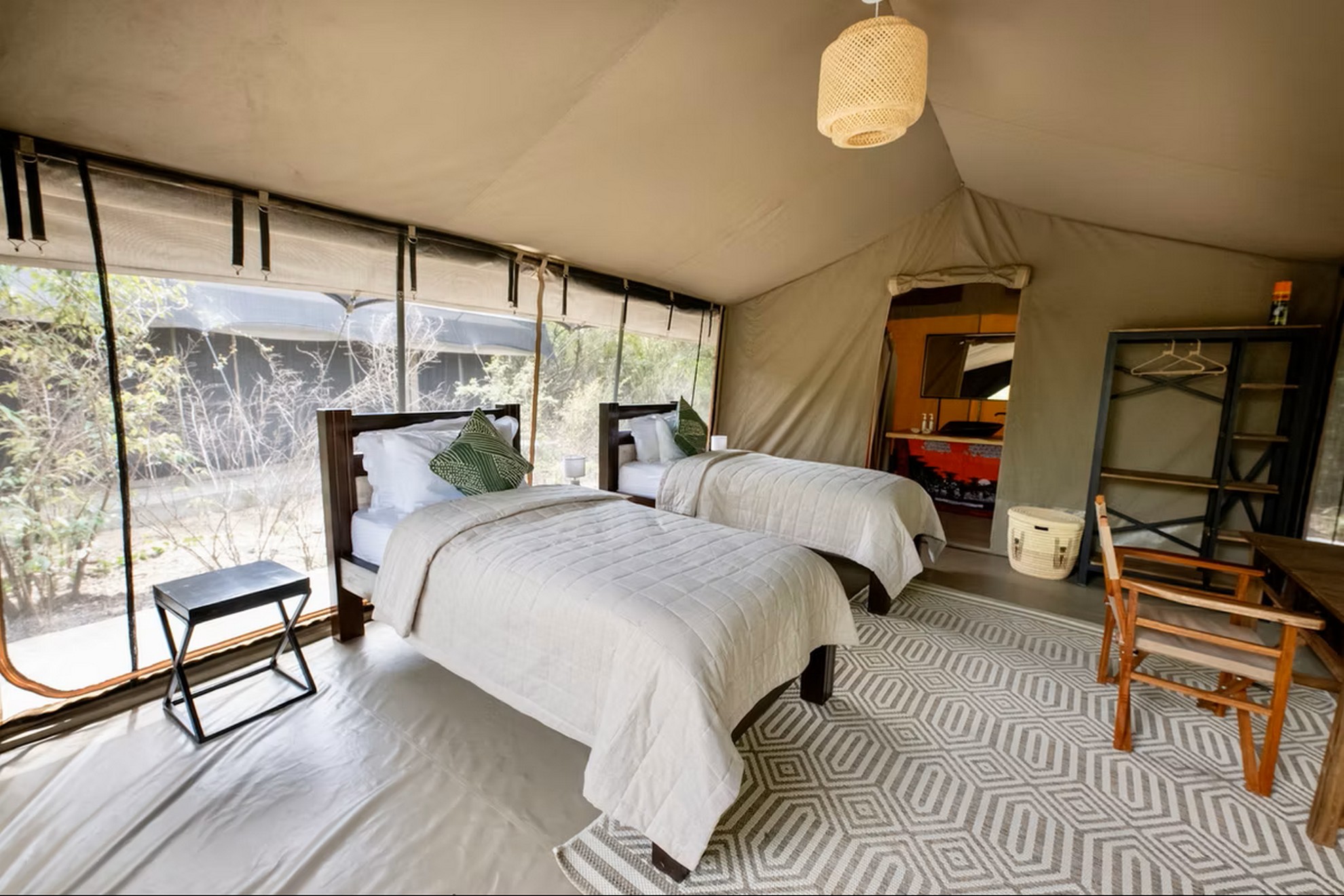 Das Olkinyei Mara Tented Camp bietet verschiedene Zeltkategorien – von funktional bis besonders komfortabel. Die Deluxe Zelte überzeugen mit großzügigem Platzangebot, bequemen Doppel- oder Einzelbetten, Moskitonetzen, einem privaten Badezimmer mit Dusche und WC sowie einer eigenen Terrasse mit Sitzgelegenheiten. Noch etwas exklusiver sind die neuen Premium Zelte. Sie bieten ein aufgewertetes Raumgefühl, stilvolle Sessel, hochwertige Holzmöbel und dekorative Details wie Teppiche oder kunstvolle Stoffe. Große Panoramafenster ermöglichen euch einen ungestörten Blick in die Wildnis – manchmal direkt auf vorbeiziehende Tiere. WLAN steht kostenlos zur Verfügung.
