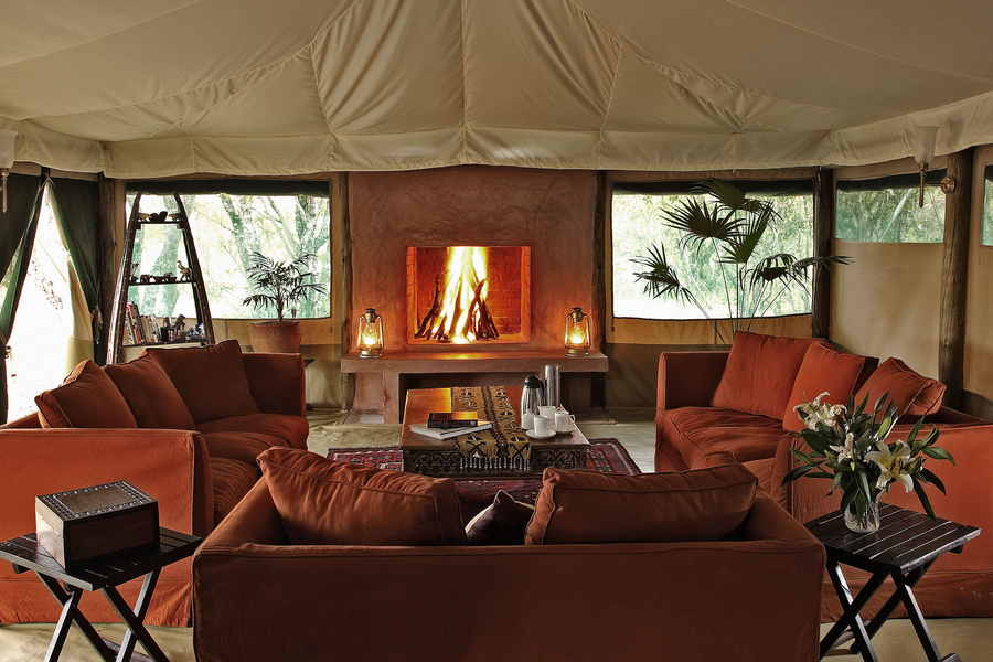 Eine geräumig Lounge und ein Speisezelt mit wohlig wärmenden Kaminen schaffen eine stilvolle und doch sehr naturnahe Atmosphäre.