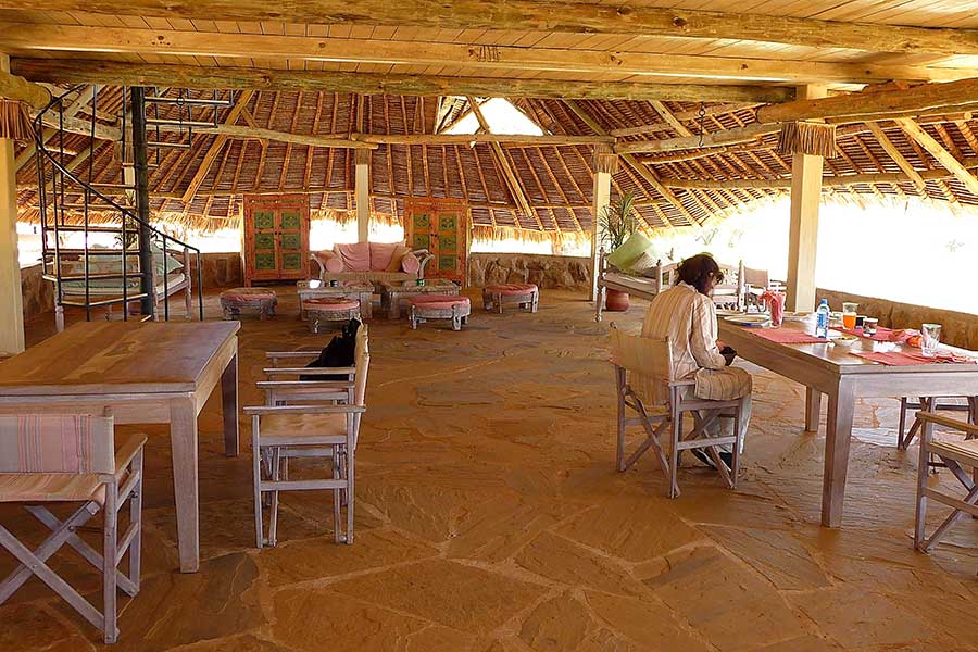 Die Ausstattung des Camps: Das Camp besteht aus einem Gemeinschaftszelt mit Ess- und Aufenthaltsraum und einem Obergeschoß, von dem aus man die spektakuläre Sicht auf den Park genießen kann. Das Camp ist landestypisch und rustikal eingerichtet, mit Galana-Stein-Böden und Strohdächern. Es gibt 3 - 4 Schlafzelte mit Doppelbetten und angeschlossenem Badezimmer. Die Bäder sind nach oben offen, es gibt fließendes Heiß- und Kaltwasser und eine Toilette mit Spülung.
