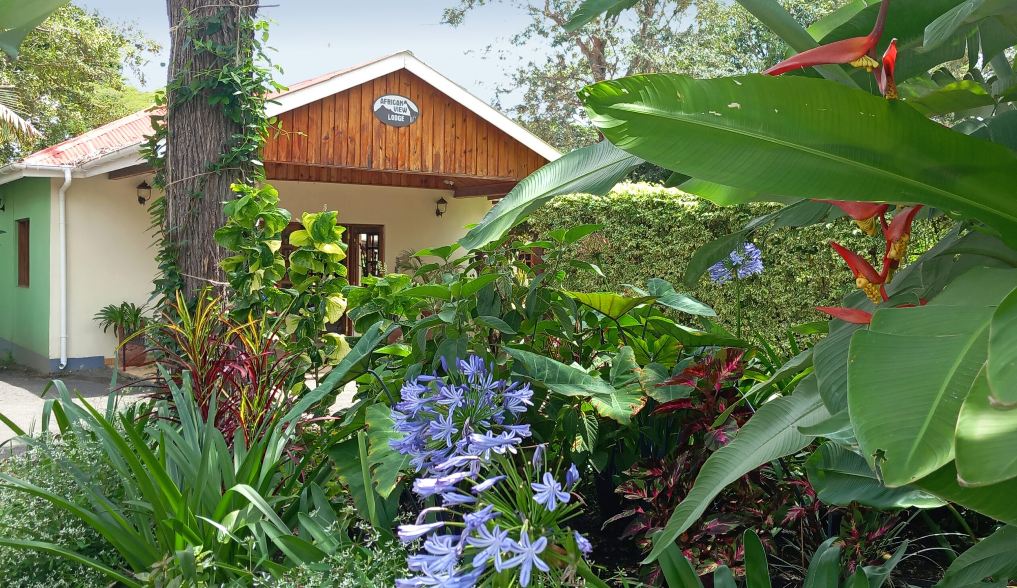 Ein liebevoll angelegter tropischer Garten umgibt die Lodge und bildet mit dem großzügigen Swimmingpool das Herzstück der Anlage. Im Restaurant mit Bar und Biergarten genießen Gäste hausgemachte Spezialitäten in entspannter Atmosphäre. Kostenloses WLAN, ein Massage-Service sowie ein Wäscheservice sorgen für zusätzlichen Komfort und machen die African View Lodge zu einem idealen Ort, um vor oder nach einer Safari zur Ruhe zu kommen.