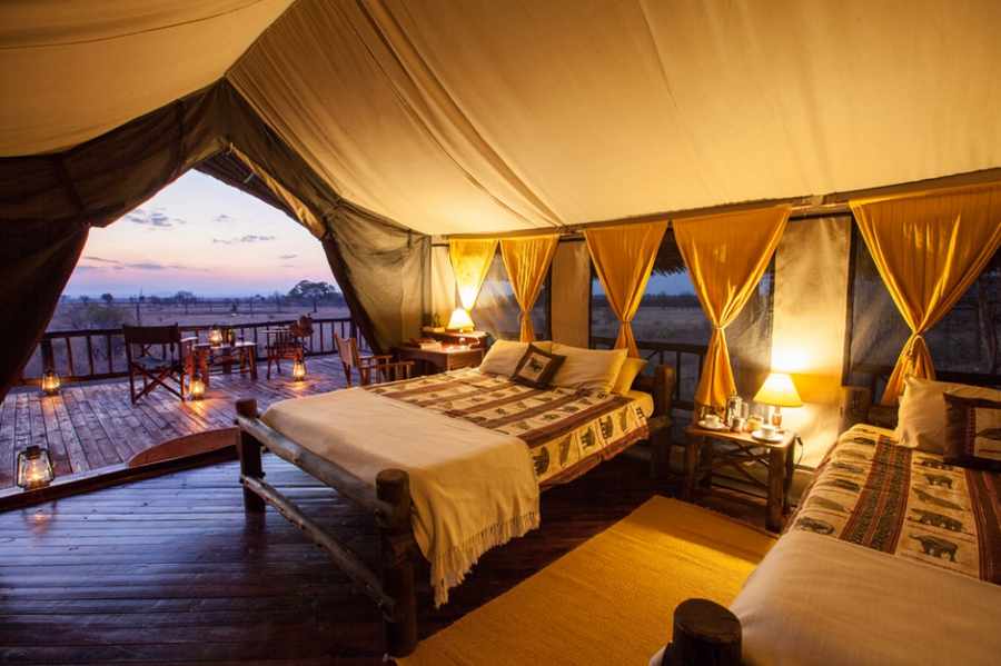 Die Lodge verfügt über 12 komfortable Safarizelte, die auf stabilen Holzplattformen rund um den Hügel errichtet sind. Diese Anordnung garantiert Privatsphäre und gleichzeitig herrliche Ausblicke in die Weite der Landschaft. Die Zelte sind zusätzlich mit traditionellen Dächern aus Palmwedeln und Stroh versehen, die für natürlichen Schatten sorgen. Großzügige Veranden mit gemütlichen Sitzgelegenheiten laden dazu ein, die umliegende Tierwelt entspannt zu beobachten. Jedes Zelt verfügt über ein eigenes Badezimmer, in dem den Gästen dank Solarheizung warmes Wasser zur Verfügung steht.