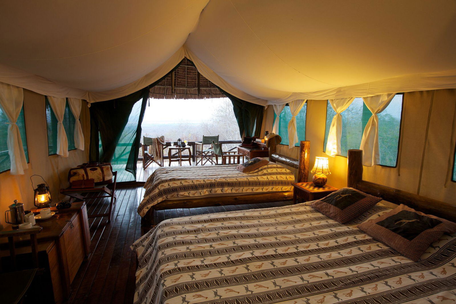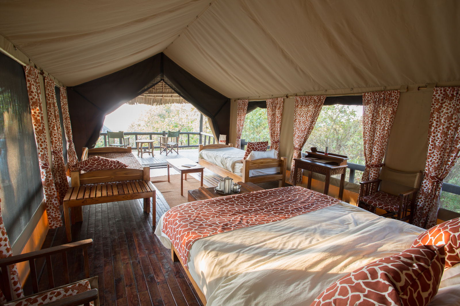 Das Camp verfügt über 16 komfortable Safarizelte, die auf festen Holzplattformen errichtet sind und ein authentisches Safari-Erlebnis mit angenehmem Komfort verbinden. Jedes Zelt ist mit einem Doppelbett und einem Einzelbett ausgestattet und eignet sich somit sowohl für Paare als auch für kleine Familien oder Freunde. Ein en-suite Badezimmer ergänzt den Innenbereich der Zelte. Der Holzboden geht nahtlos in eine großzügige Veranda über, die mit gemütlichen Sitzgelegenheiten zum Entspannen und Beobachten der umliegenden Landschaft und Tierwelt einlädt.