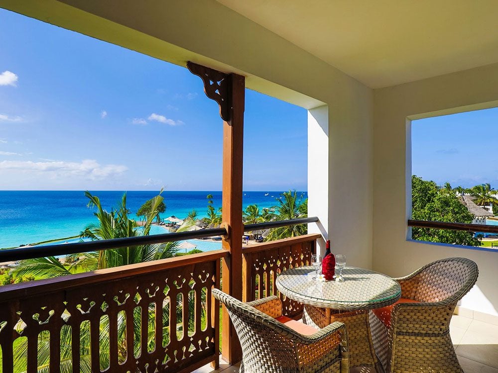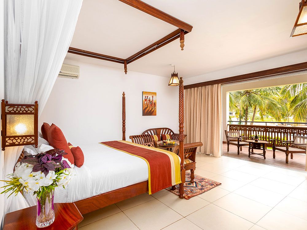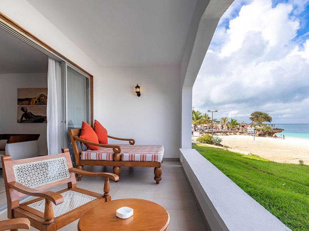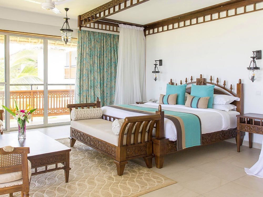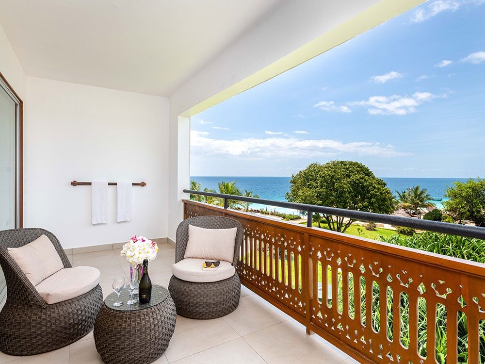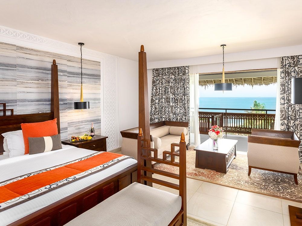 Die 96 geräumigen Zimmer und Suiten sind zur Meerseite ausgerichtet und verfügen – je nach Kategorie – über einen teilweisen oder direkten Blick auf den Indischen Ozean. Alle Unterkünfte sind komfortabel und hell gestaltet, mit großzügigen Balkonen oder Terrassen, die besonders am Abend zum Entspannen bei Meeresbrise einladen.
