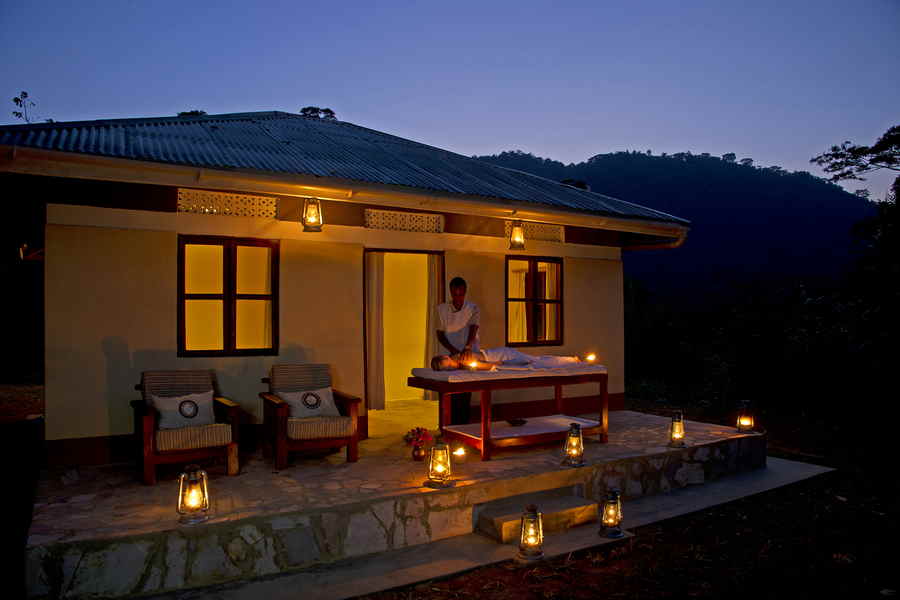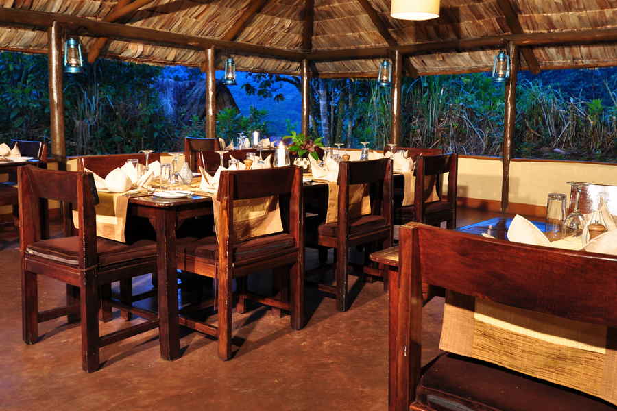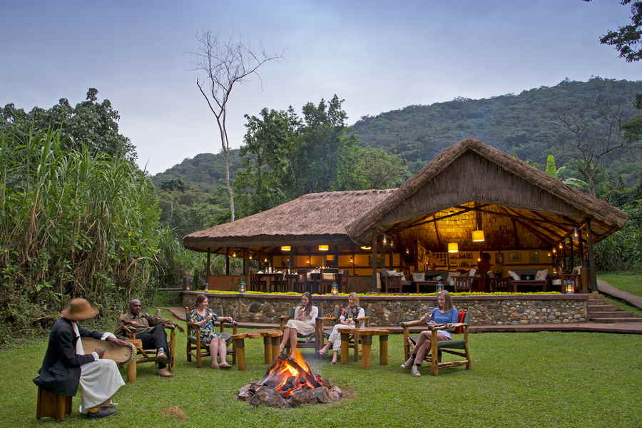 Das Herz der Lodge bildet der offene Indoor-Outdoor-Lounge- und Restaurantbereich mit Blick in den Regenwald. Am Abend sorgen Campfire-Atmosphäre, Sundowner und gelegentlich traditionelle Musik für eine besonders intime Stimmung, in der Gäste ihre Gorilla-Erlebnisse teilen. Ergänzt wird das Angebot durch ein Spa, eine Boutique mit lokal gefertigten Produkten sowie die Explorer’s Lounge, in der Karten, Bücher und Informationen zur Flora, Fauna und Kultur Ugandas bereitstehen.