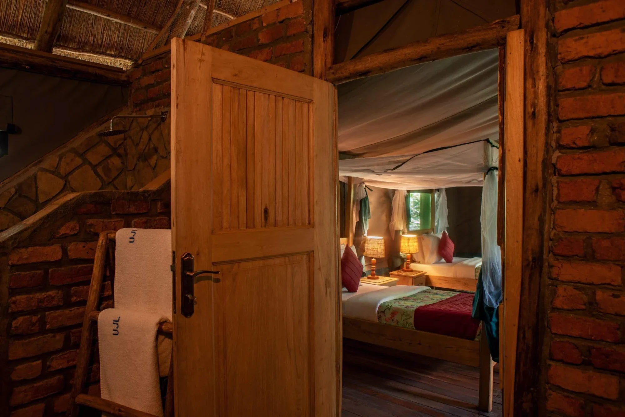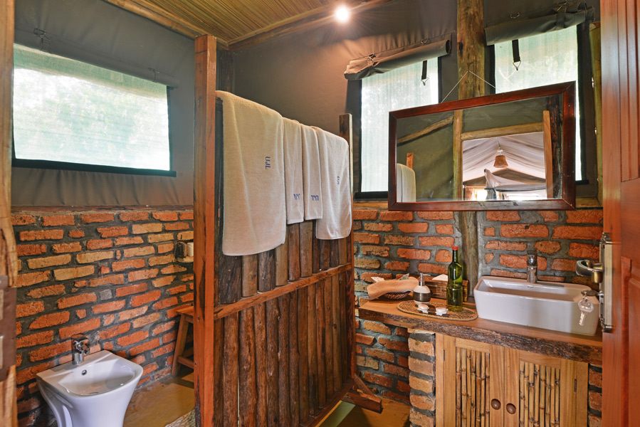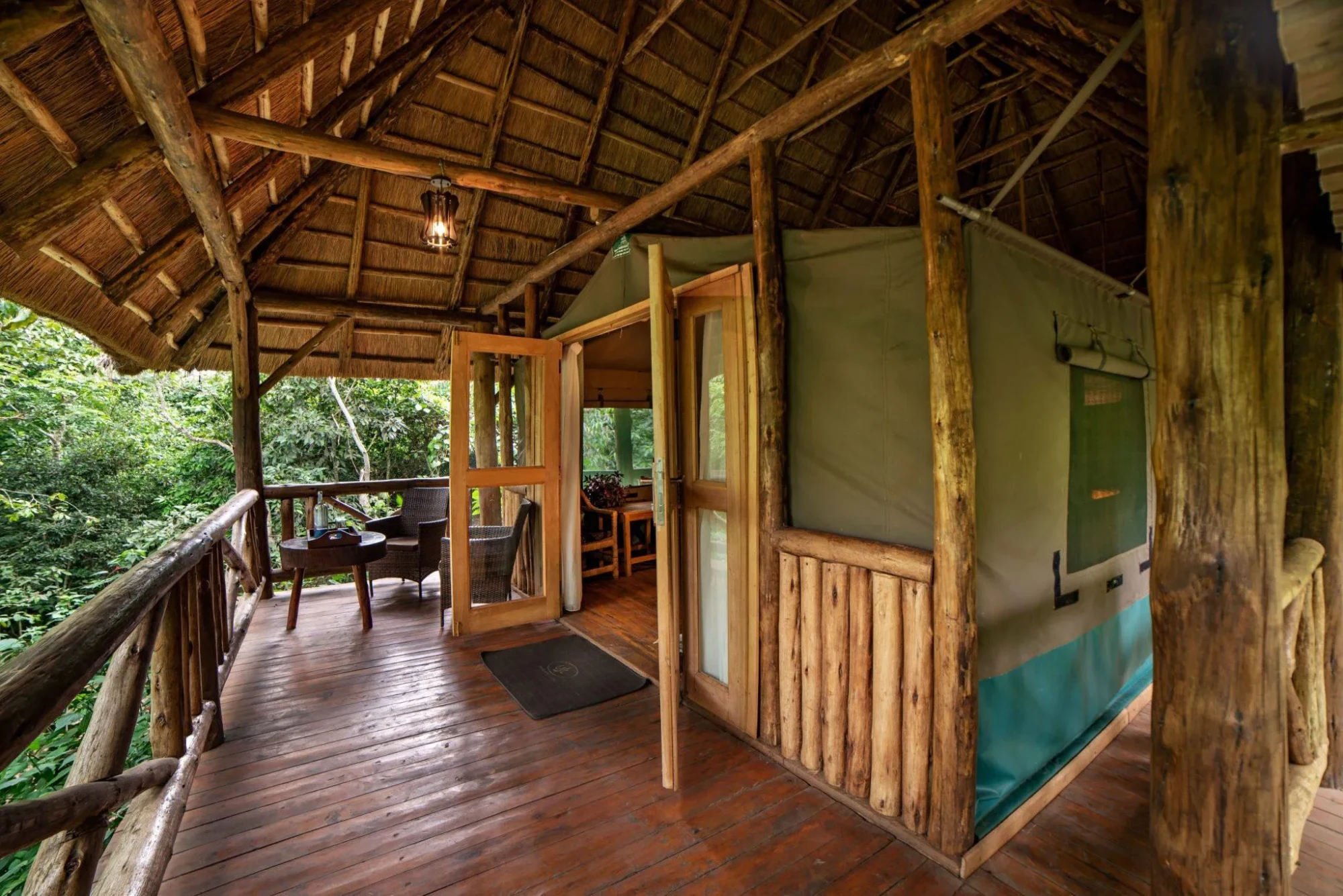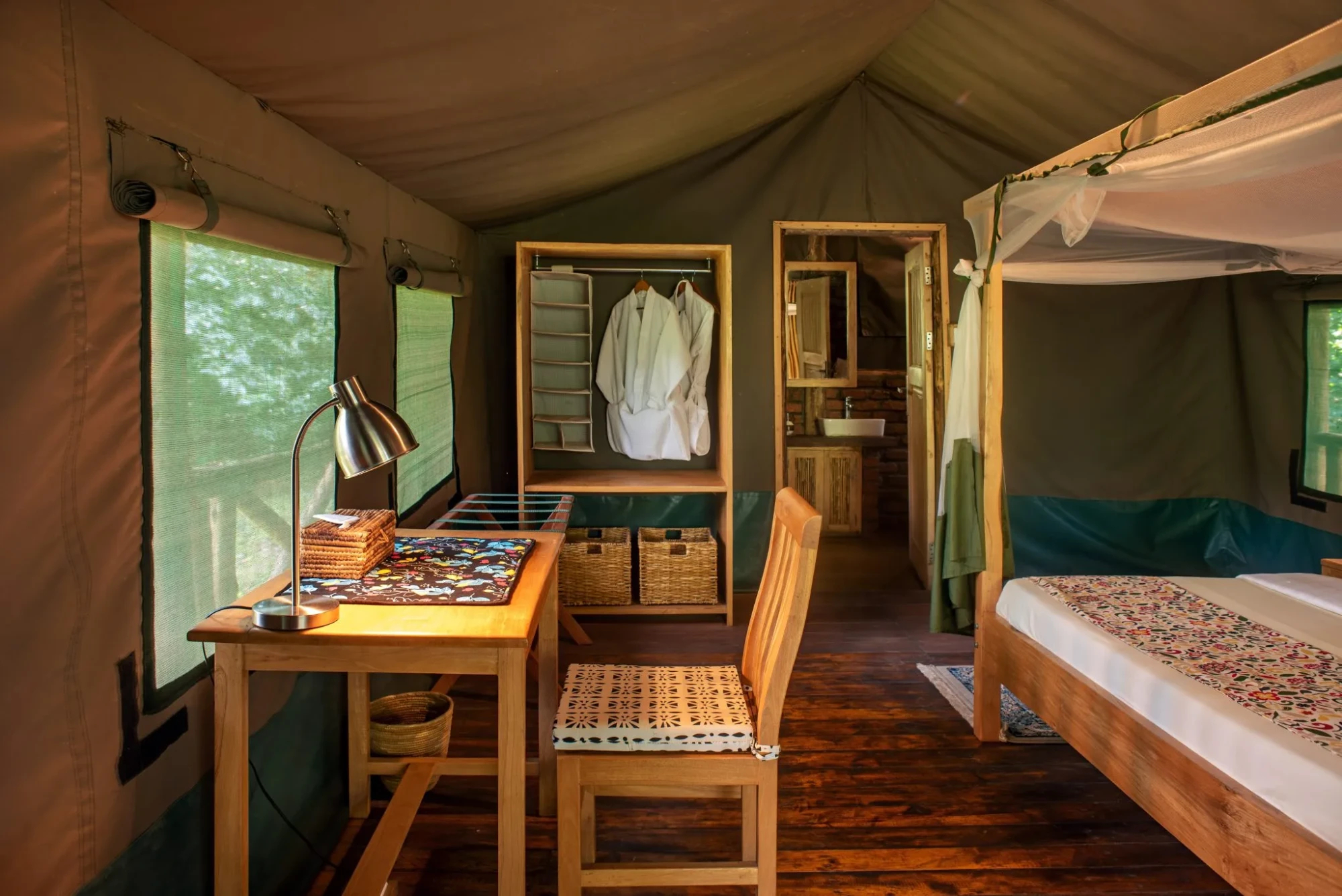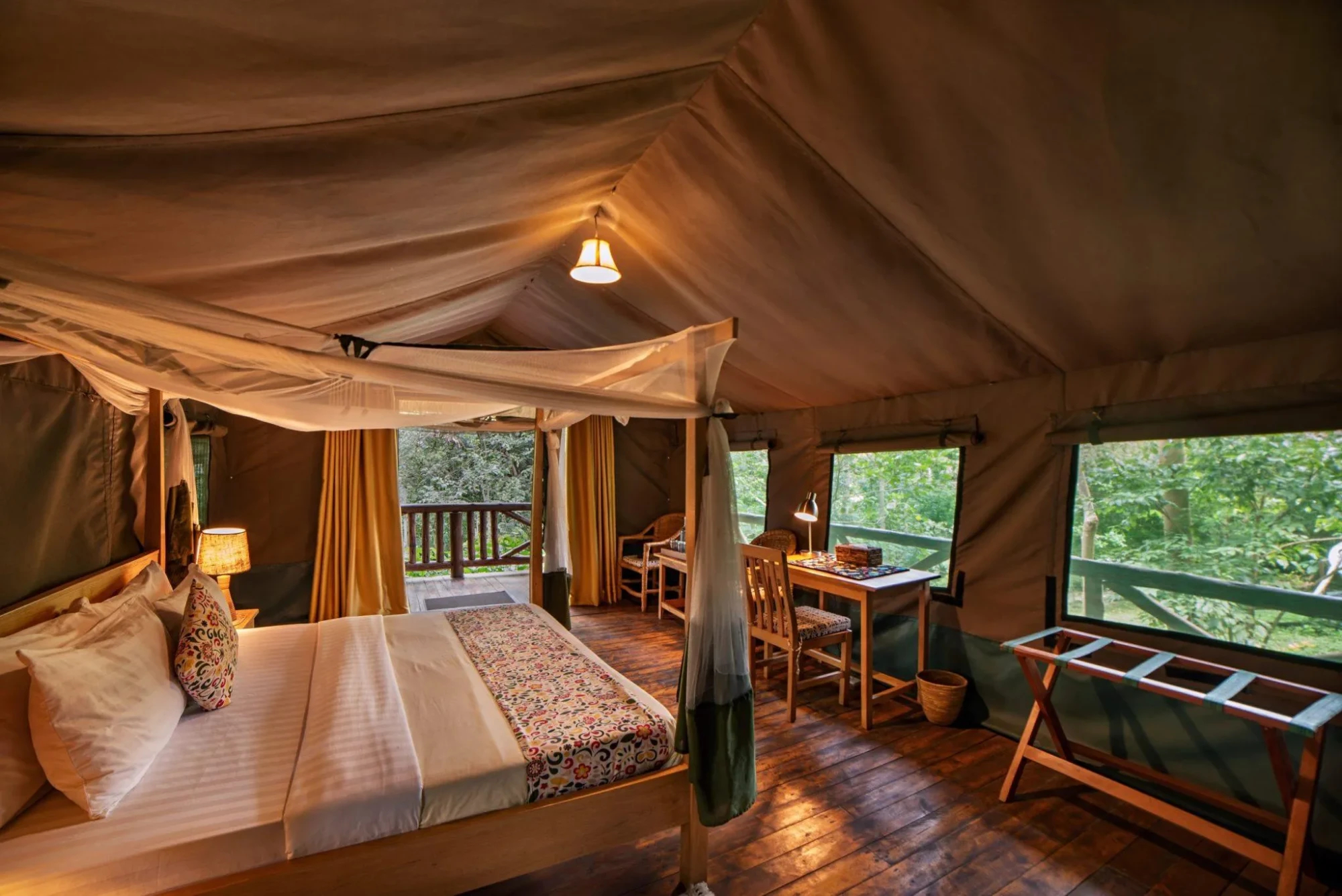 Die Bugoma Jungle Lodge bietet geräumige Safari-Zelte auf erhöhten Holzplattformen, die naturnahen Komfort mit Funktionalität verbinden. Alle Unterkünfte verfügen über ein eigenes Badezimmer, Moskitonetze, Schreibtisch, Kleiderschrank sowie eine private Terrasse mit Blick in den Wald. Die Zimmer sind wahlweise mit Doppel- oder Twin-Betten ausgestattet und eignen sich ideal für Paare, Alleinreisende oder gemeinsam reisende Gäste, die ein authentisches Dschungelerlebnis in ruhiger Umgebung suchen.