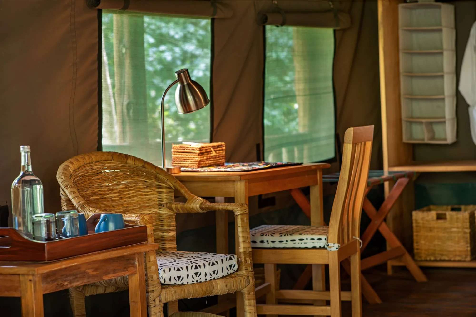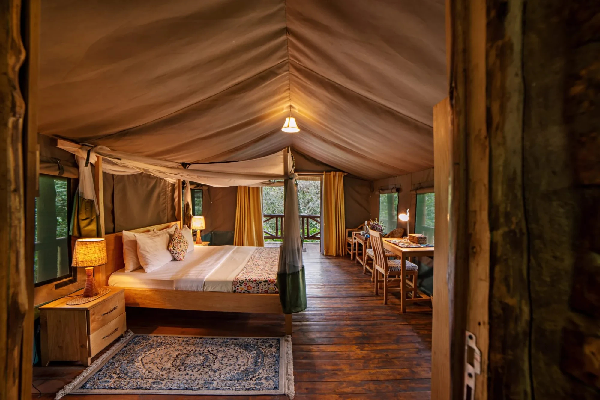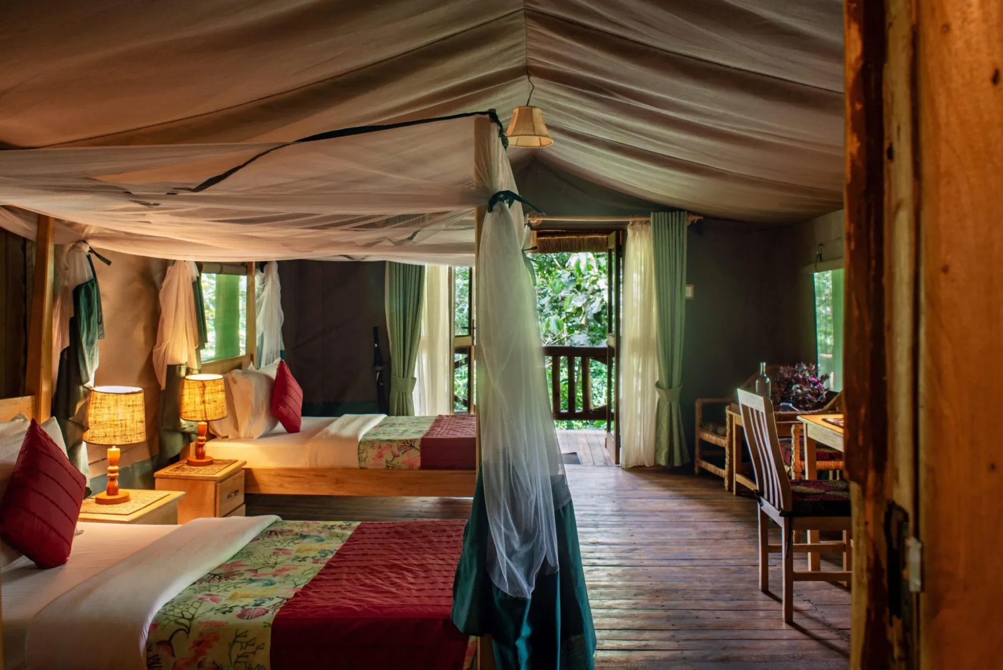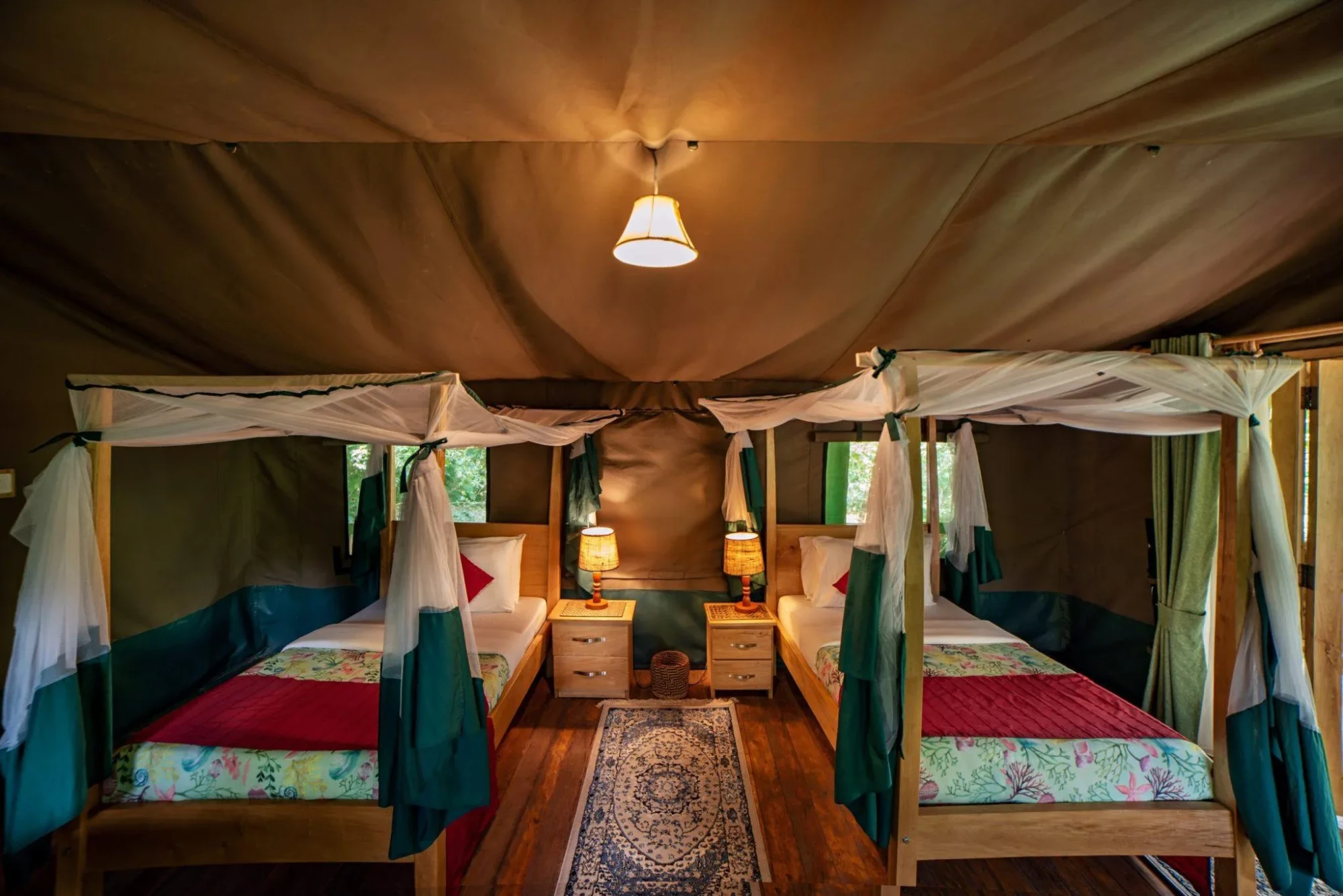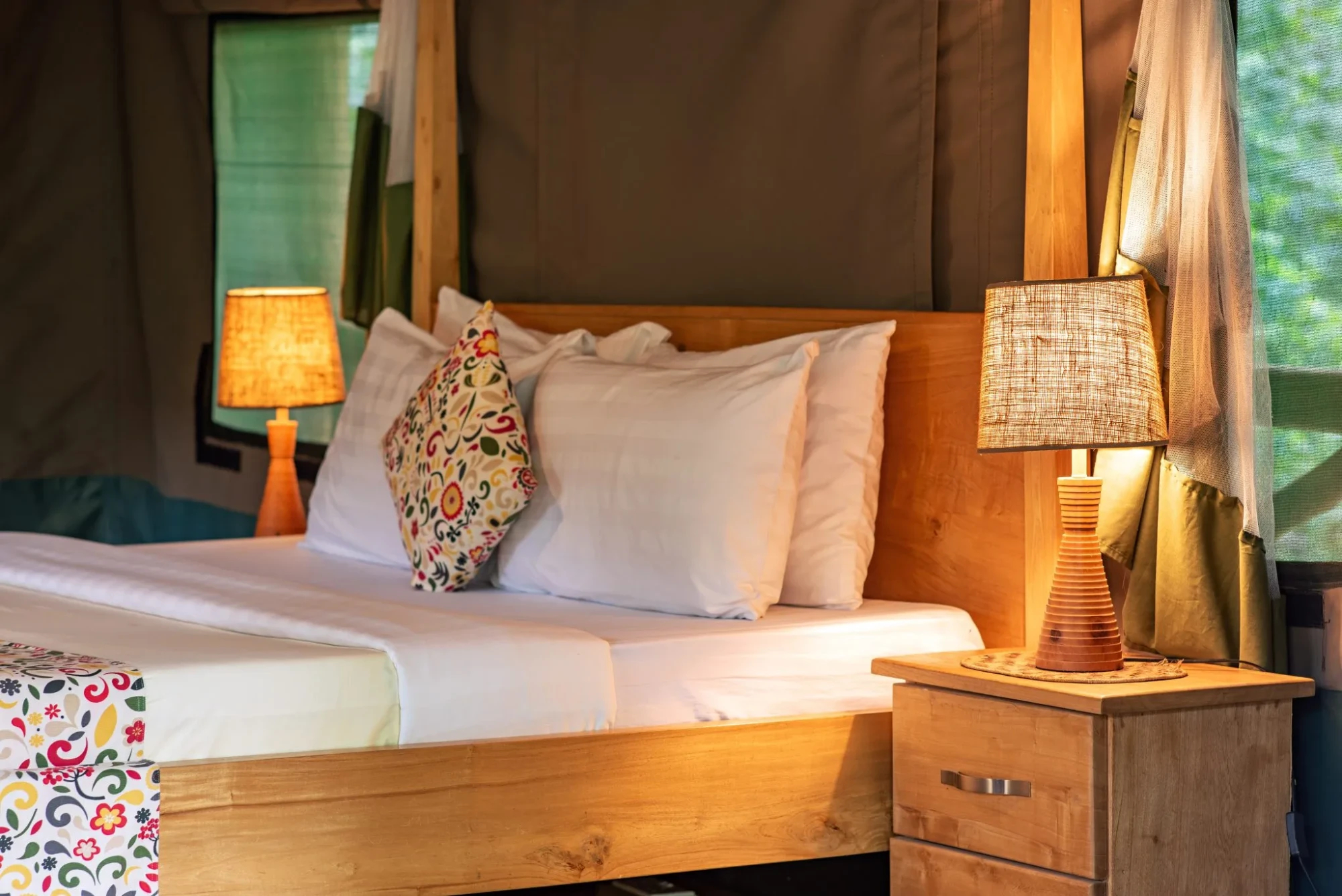 Die Bugoma Jungle Lodge bietet geräumige Safari-Zelte auf erhöhten Holzplattformen, die naturnahen Komfort mit Funktionalität verbinden. Alle Unterkünfte verfügen über ein eigenes Badezimmer, Moskitonetze, Schreibtisch, Kleiderschrank sowie eine private Terrasse mit Blick in den Wald. Die Zimmer sind wahlweise mit Doppel- oder Twin-Betten ausgestattet und eignen sich ideal für Paare, Alleinreisende oder gemeinsam reisende Gäste, die ein authentisches Dschungelerlebnis in ruhiger Umgebung suchen.