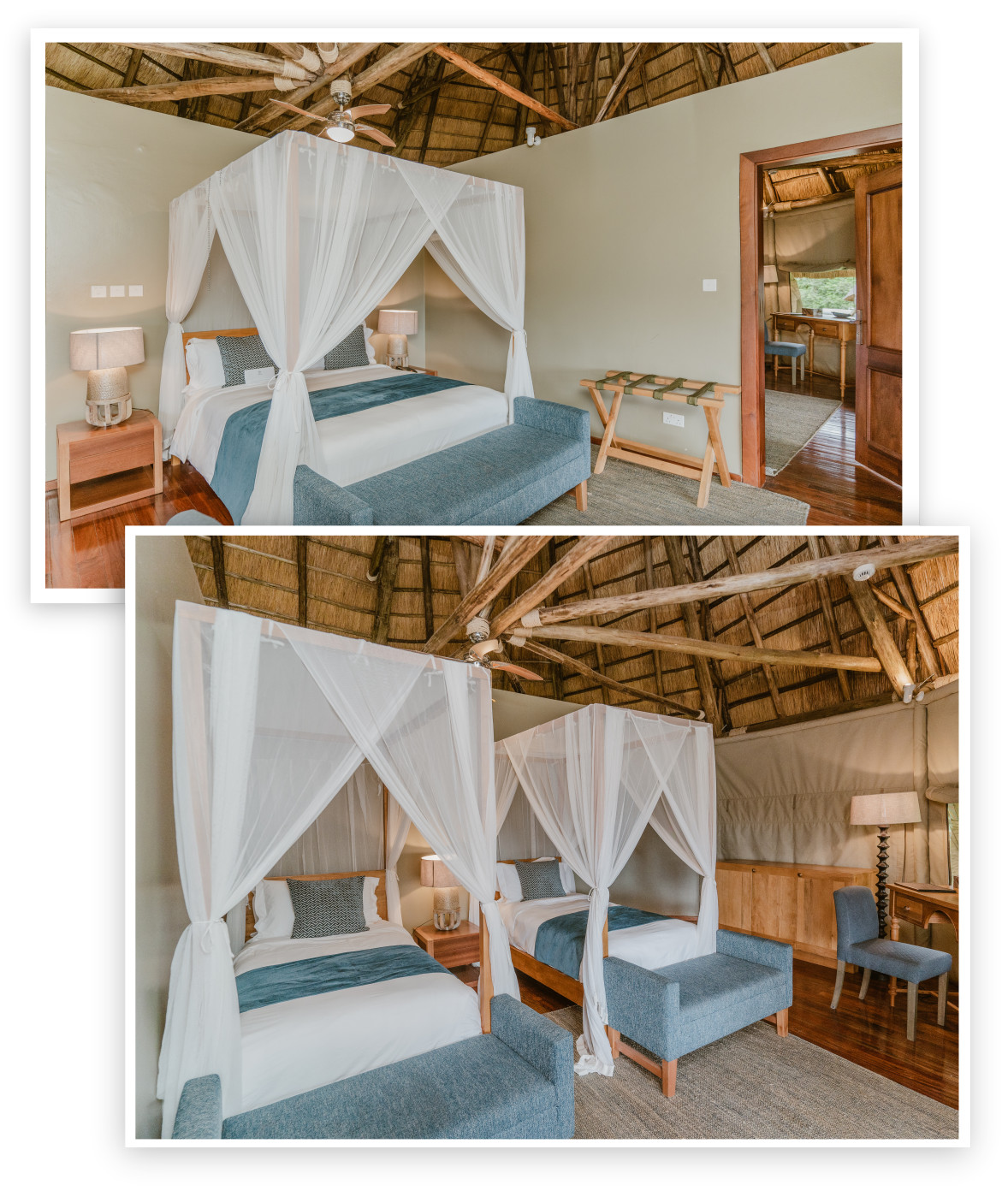 Die Lodge verfügt über 9 Deluxe Bandas, 2 Family Bandas und 1 Honeymoon Banda. Die Deluxe Bandas sind mit Doppel- oder Twin-Betten ausgestattet und eignen sich für Paare oder Freunde, während die Family Bandas mit zwei Schlafzimmern ideal für Familien oder kleine Gruppen sind. Die Honeymoon Banda bietet Paaren besondere Privatsphäre in ruhiger Lage. Alle Bandas sind en-suite, komfortabel eingerichtet und verfügen über Moskitonetze, gemütliche Sitzbereiche und eine private Veranda. Natürliche Materialien, warme Erdtöne und lokale Kunst schaffen eine entspannte Atmosphäre, ergänzt durch Ausblicke auf See, Savanne oder Akazienlandschaft.