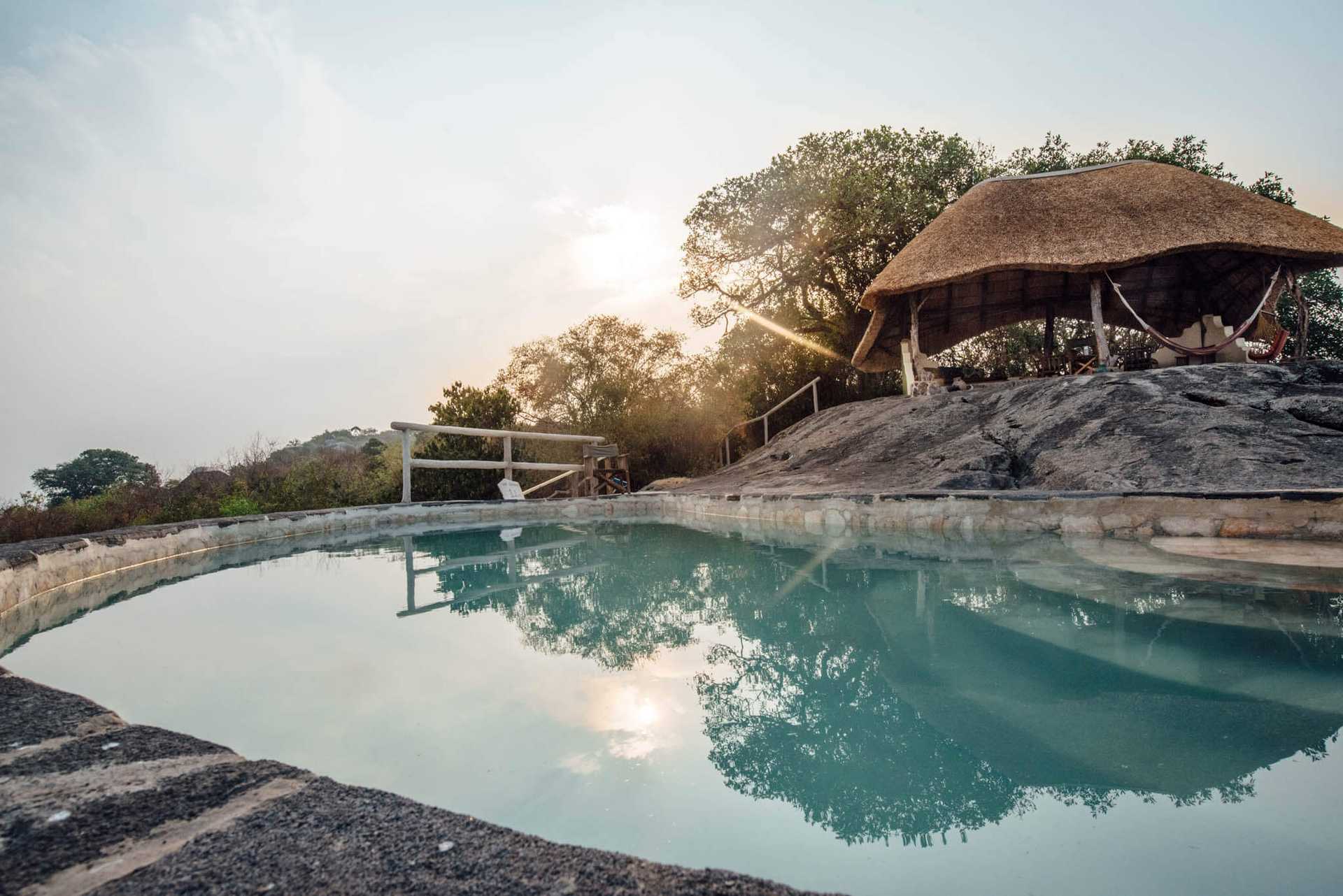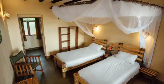 Im offen gestalteten Hauptgebäude befinden sich das Restaurant und die Bar, die nicht nur durch ihre Aussicht, sondern auch durch ihre Küche überzeugen. Serviert werden ugandische Gerichte mit westlichen Einflüssen, frisch zubereitet und liebevoll präsentiert. Ergänzt wird das Lodge-Erlebnis durch einen Swimmingpool mit Aussicht, gemütliche Sitzbereiche sowie eine Lagerfeuerstelle, an der Gäste abends unter dem afrikanischen Sternenhimmel zusammenkommen.