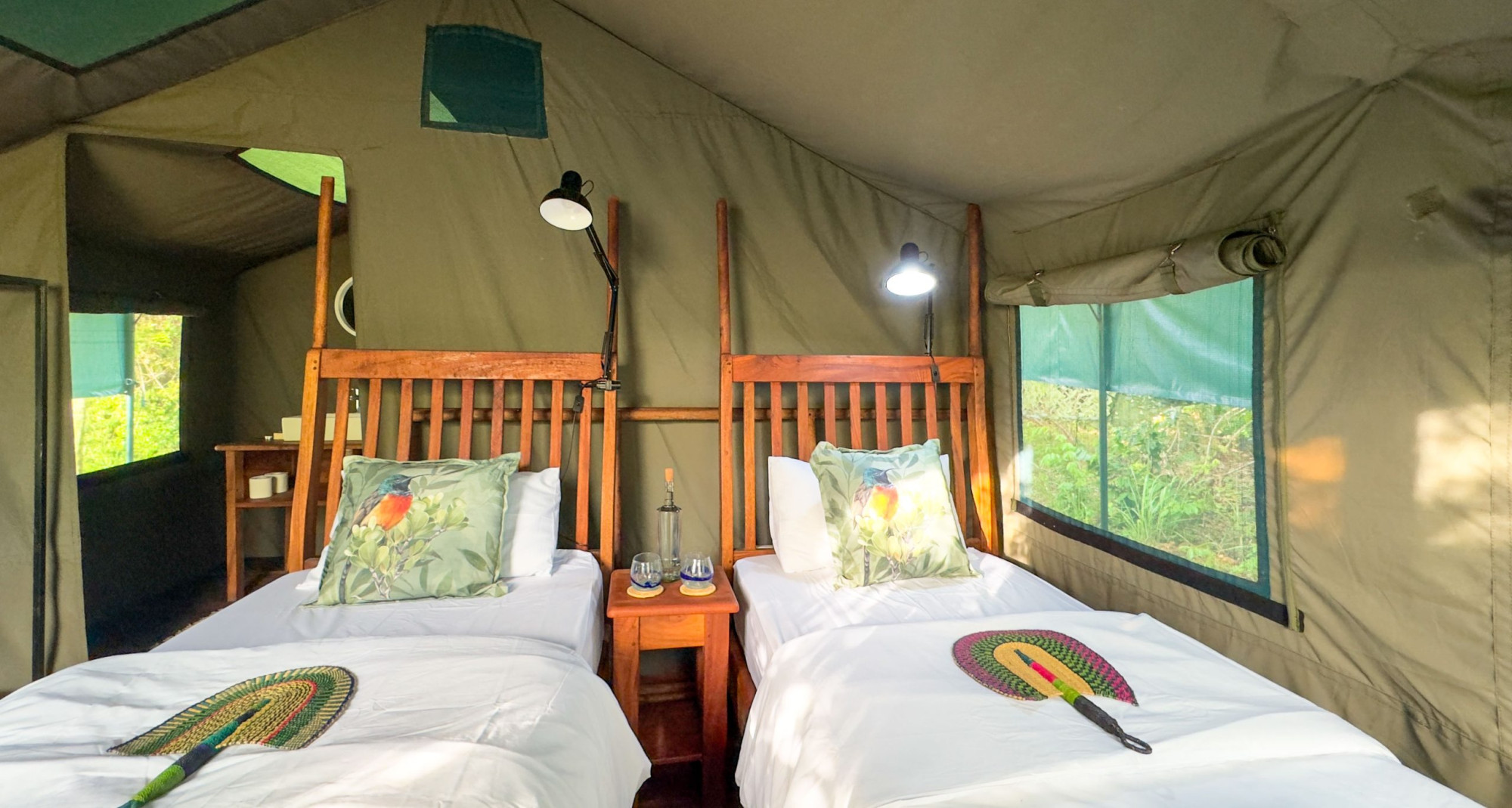 Die Unterkunft verfügt über komfortable, fest installierte Safari-Zelte, die in Double Rooms und Twin Rooms unterteilt sind. Die Double Rooms sind mit einem Doppelbett ausgestattet und eignen sich ideal für Paare oder Alleinreisende, während die Twin Rooms über zwei Einzelbetten verfügen und sich besonders für Freunde oder gemeinsam reisende Gäste anbieten. Alle Zelte besitzen ein eigenes Badezimmer mit Dusche und WC sowie eine private Veranda mit Sitzgelegenheiten, von der aus sich der Blick auf die Natur und den Fluss genießen lässt.