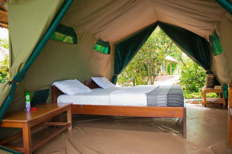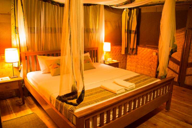 Die 10 einfachen Zelte sind eine budgetfreundliche Option für naturverbundene Reisende. Sie sind mit bequemen Betten, Nachttisch und Stromanschluss ausgestattet und stehen unter einem grasgedeckten Dach, das Schatten und Privatsphäre bietet. Diese Zelte teilen sich gemeinschaftliche Sanitäranlagen mit Duschen und Spültoiletten. Bettwäsche und Handtücher werden gestellt.